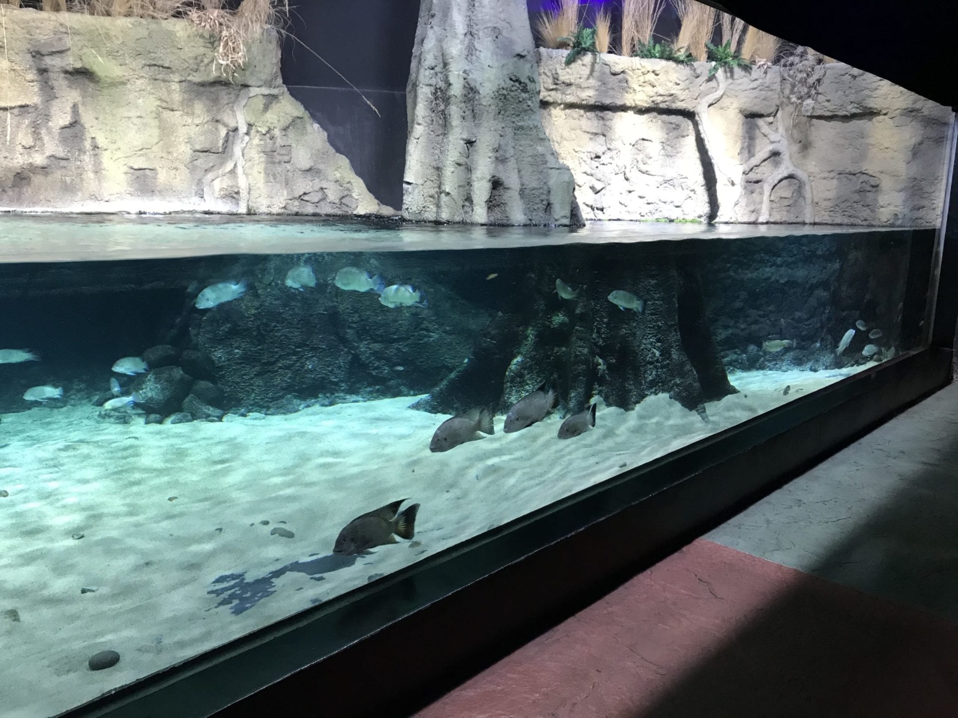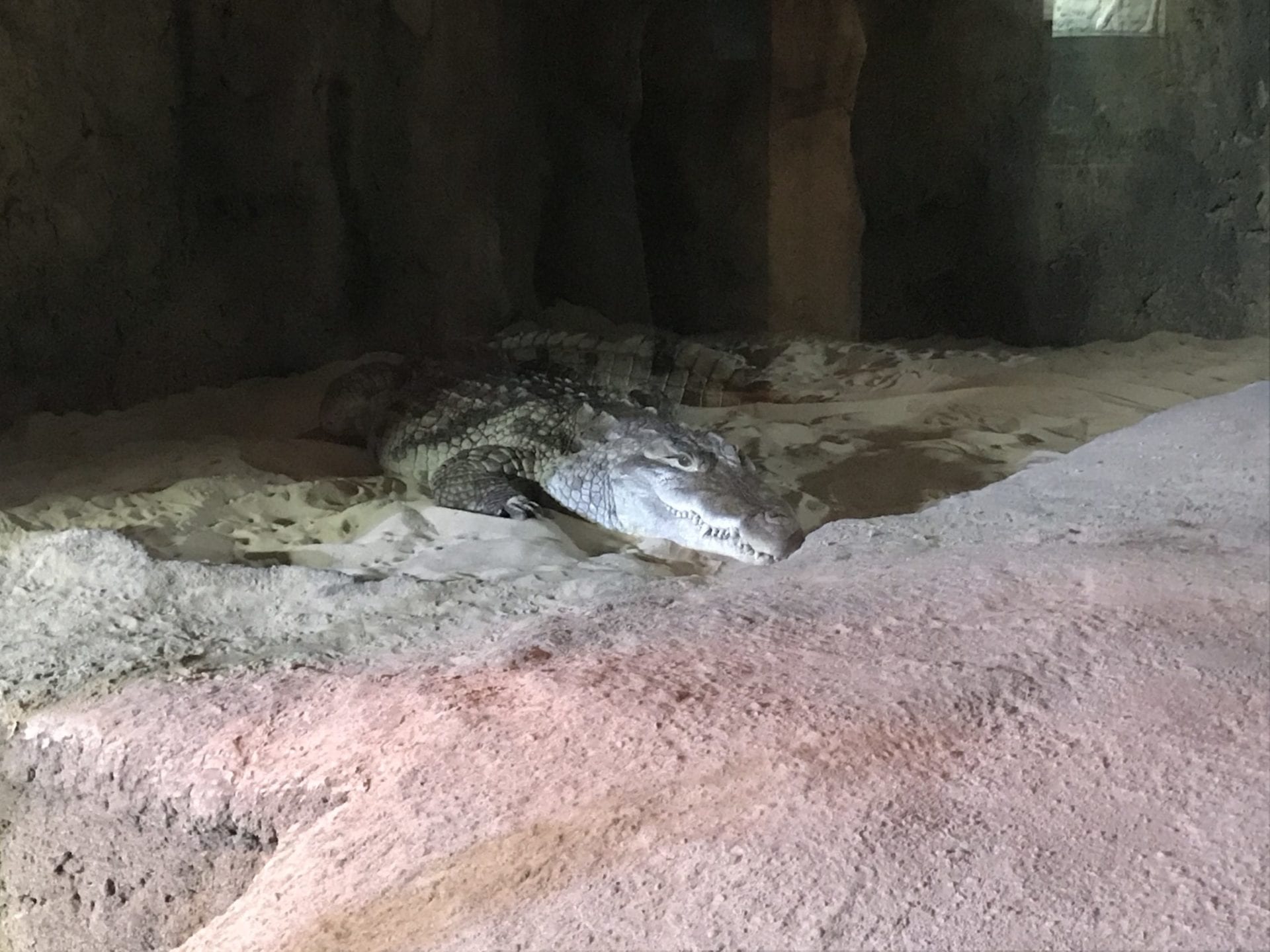 Nous parcourons le Rhône et observons ses poissons, des Alpes à la Camargue en passant par le Léman. Puis, un tunnel de verre traversant un grand aquarium (qui nous a paru un peu moins transparent qu’à notre première visite) nous guide vers une étrange créature préhistorique : le spinosaure. La présence de ce dinosaure géant dans cet aquarium est assez inattendue, et sa mise en scène est faite pour être inquiétante (un environnement sombre, un éclairage des griffes projetant leur ombre sur le sol, des grognements sonores…). Nous avons rapidement emprunté l’escalier longeant le specimen pour éviter a notre bébé de prendre peur.