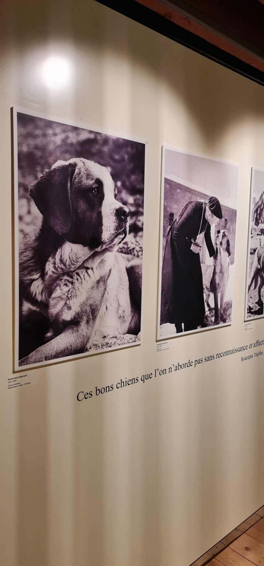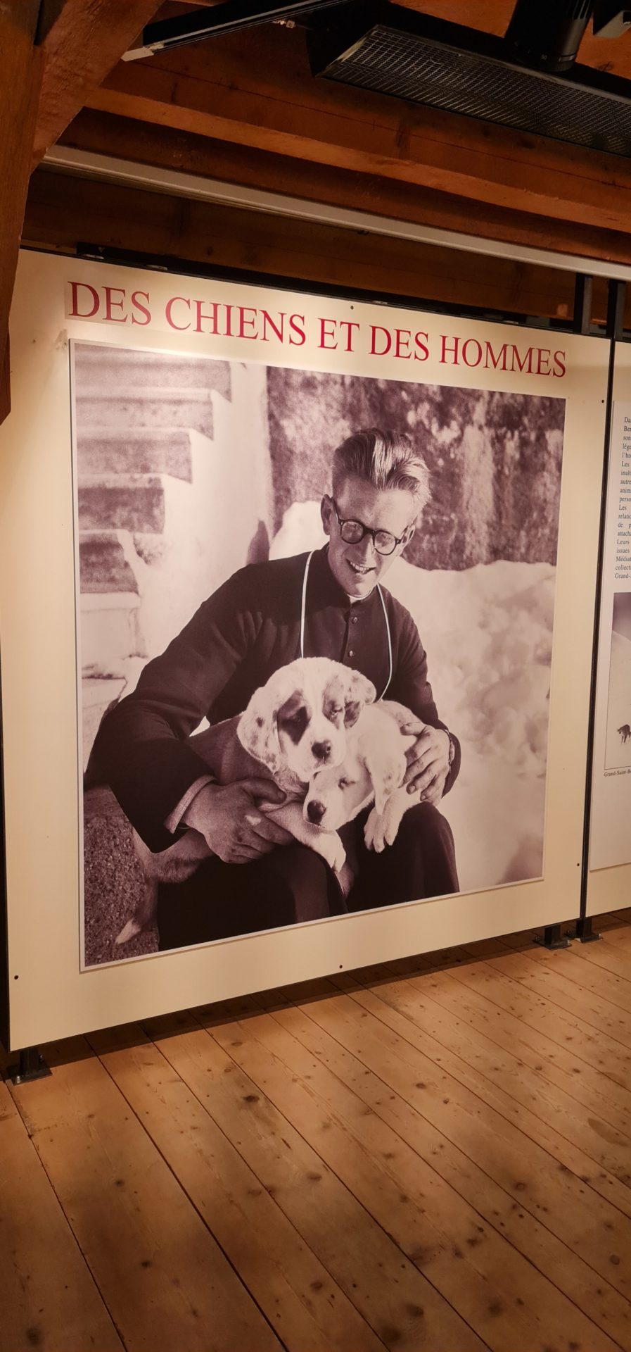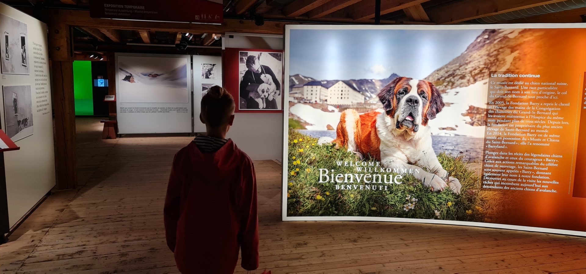 Une fois la visite des chiens et des chiots terminĂ©e, nous avons entamĂ© la dĂ©couverte du musĂ©e. Celui-ci se trouve au premier Ă©tage dans un espace boisĂ© trĂšs apprĂ©ciable et pas trop vaste. De nombreux clichĂ©s historiques mettent en avant l’histoire du St-Bernard et surtout son lien avec l’Hospice du Grand-St-Bernard et les chanoines qui y habitaient. La prĂ©sence du chien national y est attestĂ©e par des documents depuis plus de 300 ans. PerchĂ©s au sommet du col du mĂȘme nom, les chiens robustes Ă©taient utilisĂ©s pour guider les voyageurs et sauver les malheureux perdus dans le brouillard ou sous les neiges. Les images en grand format permettent aux enfants de suivre le fil sans forcĂ©ment avoir la nĂ©cessitĂ© de lire les explicatifs (pratique pour les plus jeunes). Au mĂȘme Ă©tage, une photobox propose d’immortaliser sa visite en se mettant en scĂšne dans divers contextes. Les garçons ont adorĂ© cette expĂ©rience. Il est possible soit d’imprimer l’image sur place (2.-) ou alors de la tĂ©lĂ©charger ensuite en ligne (gratuit).