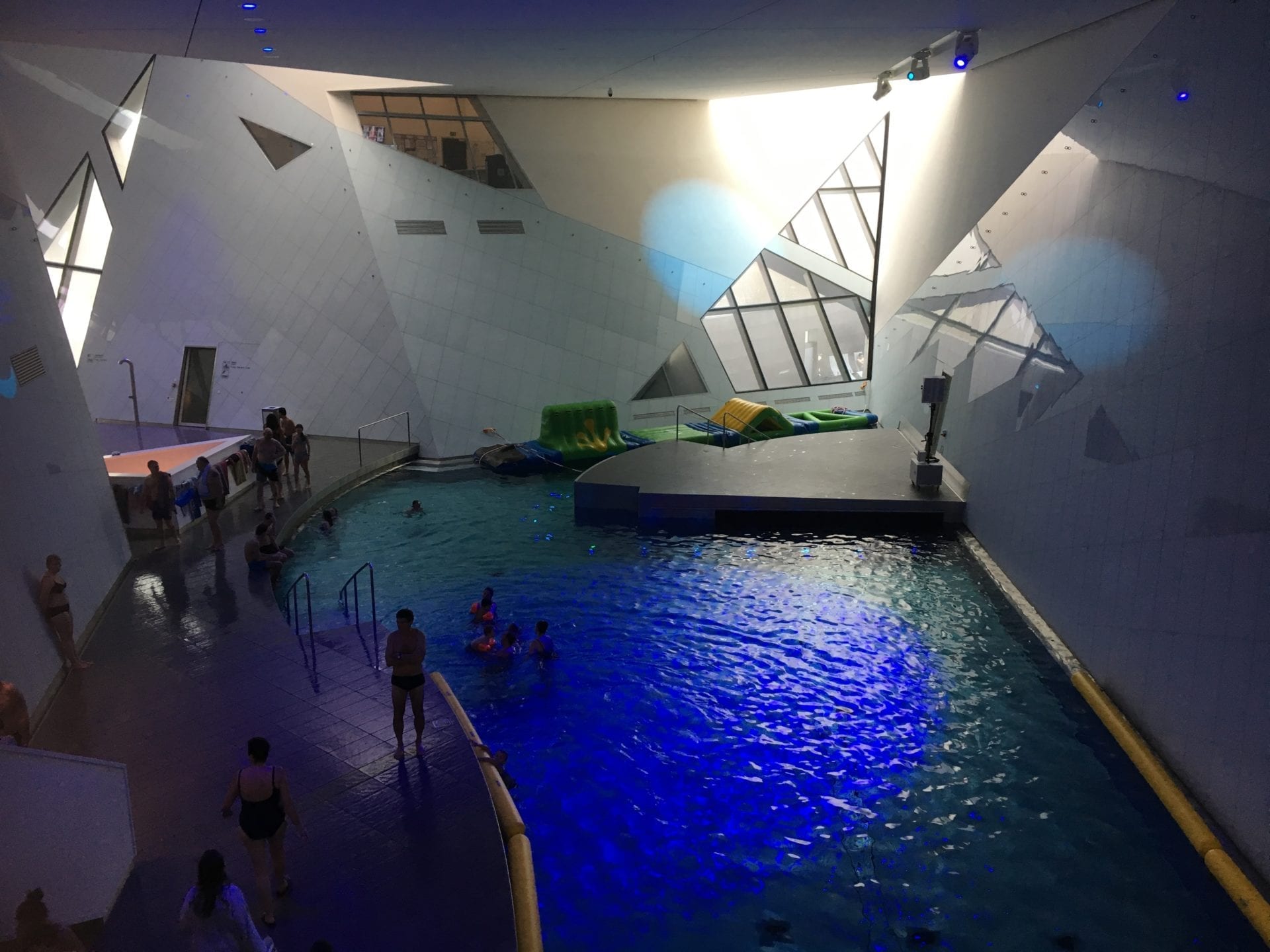 Vous y trouverez Ă©galement deux bassins dâeaux salines. Lâun de ces bassins, le Solaqua, se trouve dans un espace fermĂ© et sombre, Ă©clairĂ© de quelques douces lumiĂšres et agrĂ©mentĂ© dâun Ă©cran gĂ©ant sur lequel est diffusĂ©, selon les jours, documentaires, images ou films sur le thĂšme du froid, de la glace et de la neige.