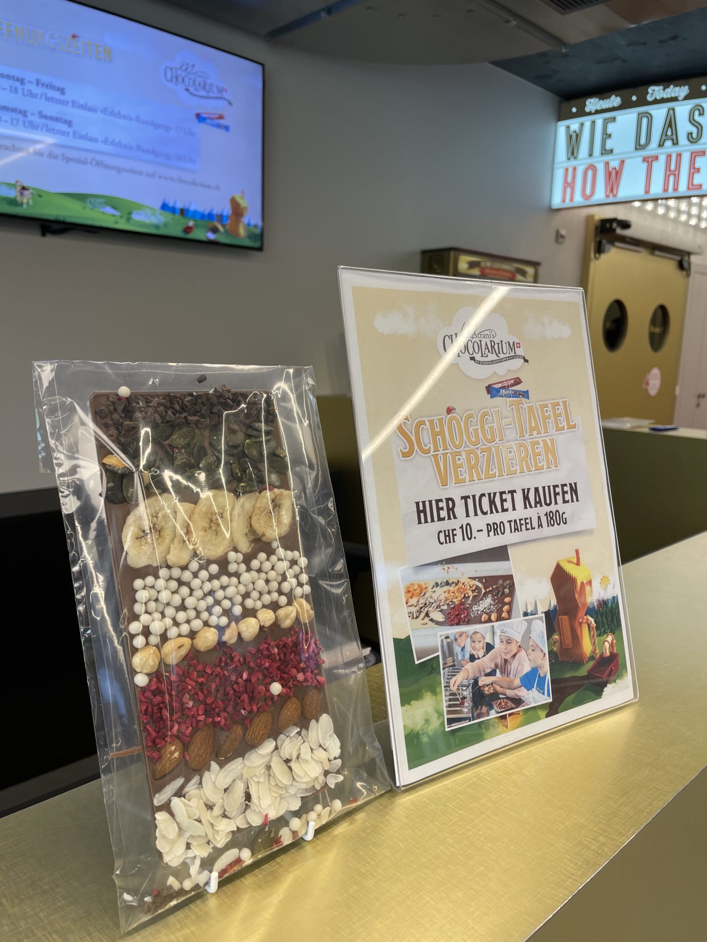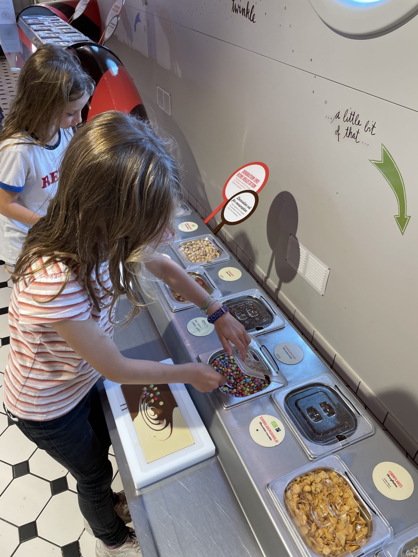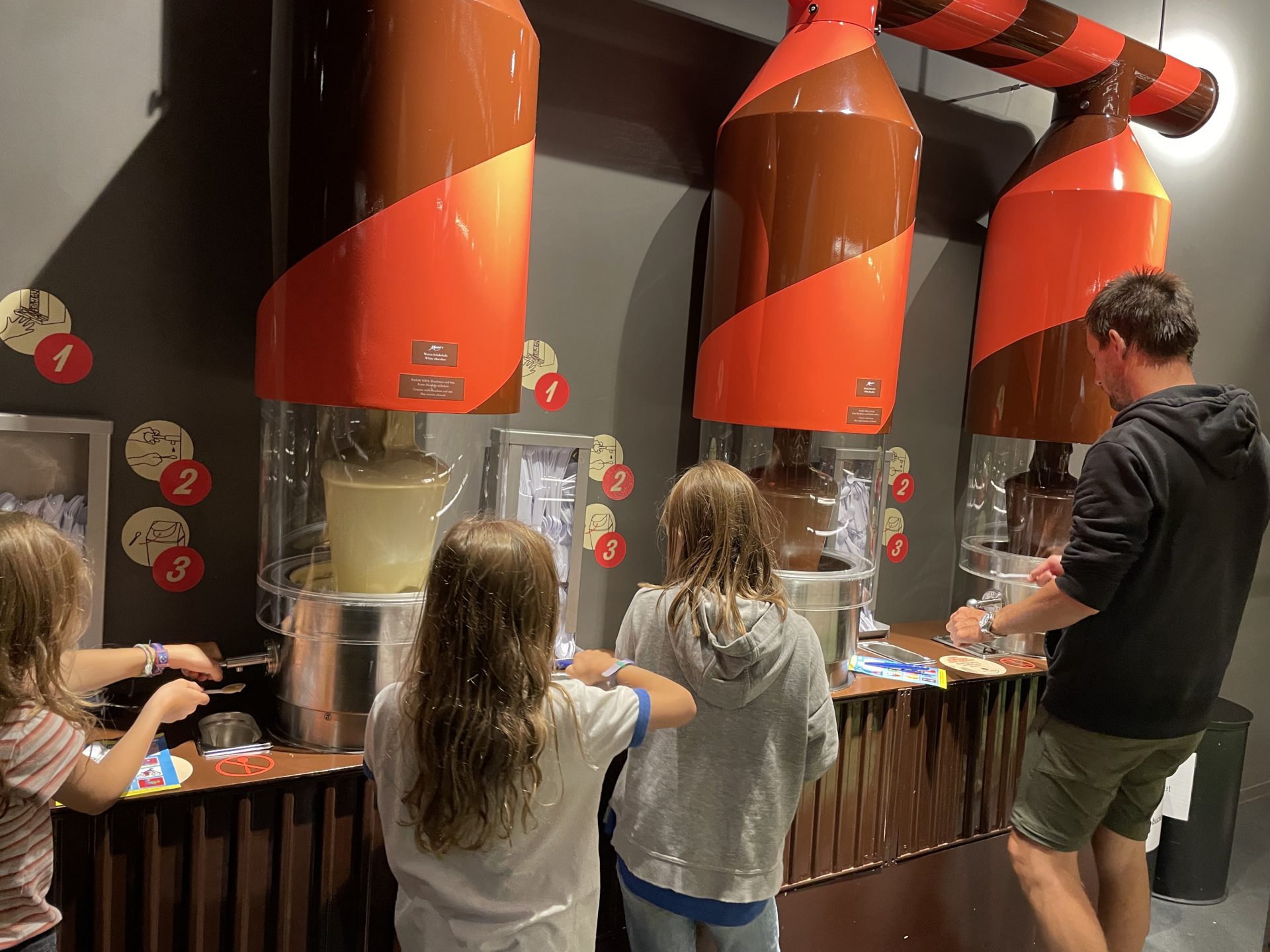 À l’entrĂ©e, nous avons ajoutĂ© un supplĂ©ment pour chacun de nos enfants afin qu’ils puissent crĂ©er une plaque de chocolat lors du passage dans la salle de l’atelier de fabrication en fin de parcours. Pour les dĂ©tenteurs de la carte coop family, le prix de l’atelier coĂ»te 5 frs au lieu de 10 frs. Cette partie est trĂšs chouette. Nos enfants ont eu beaucoup de plaisir. L’atelier est rapide et les parents ne s’ennuyent pas trop.