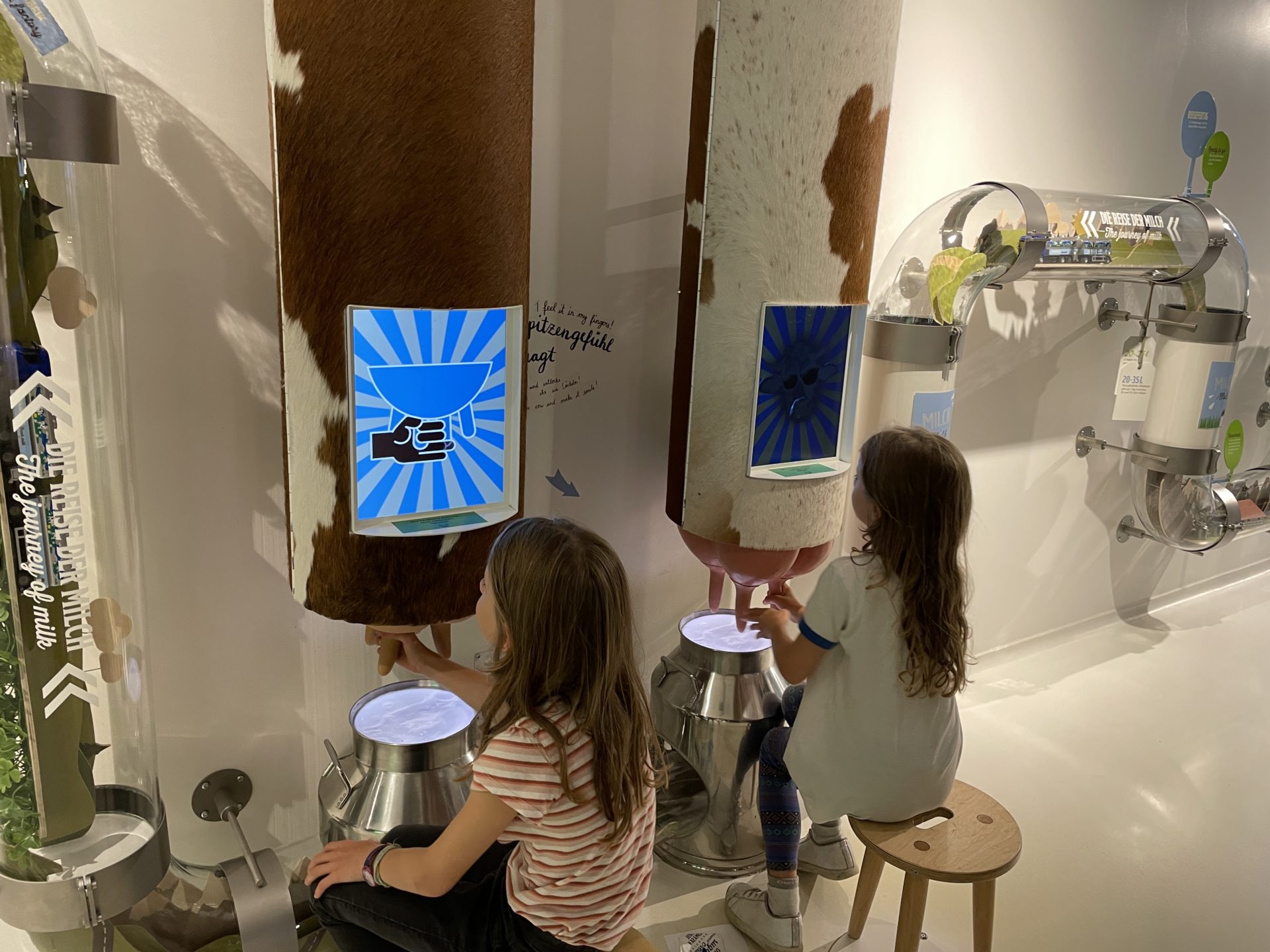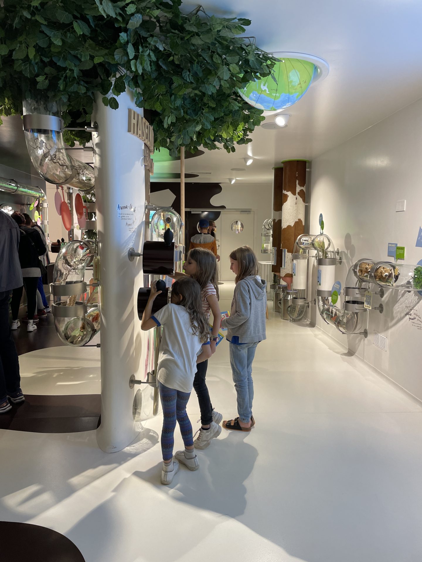 La premiĂšre salle est la salle des matiĂšres premiĂšres. Les enfants ont pu s’activer pour mieux comprendre. Ils ont secouĂ© le noisetier et on trait la vache. Tout le parcours est imaginĂ© ainsi, les enfants peuvent toucher, manipuler et dĂ©couvrir.