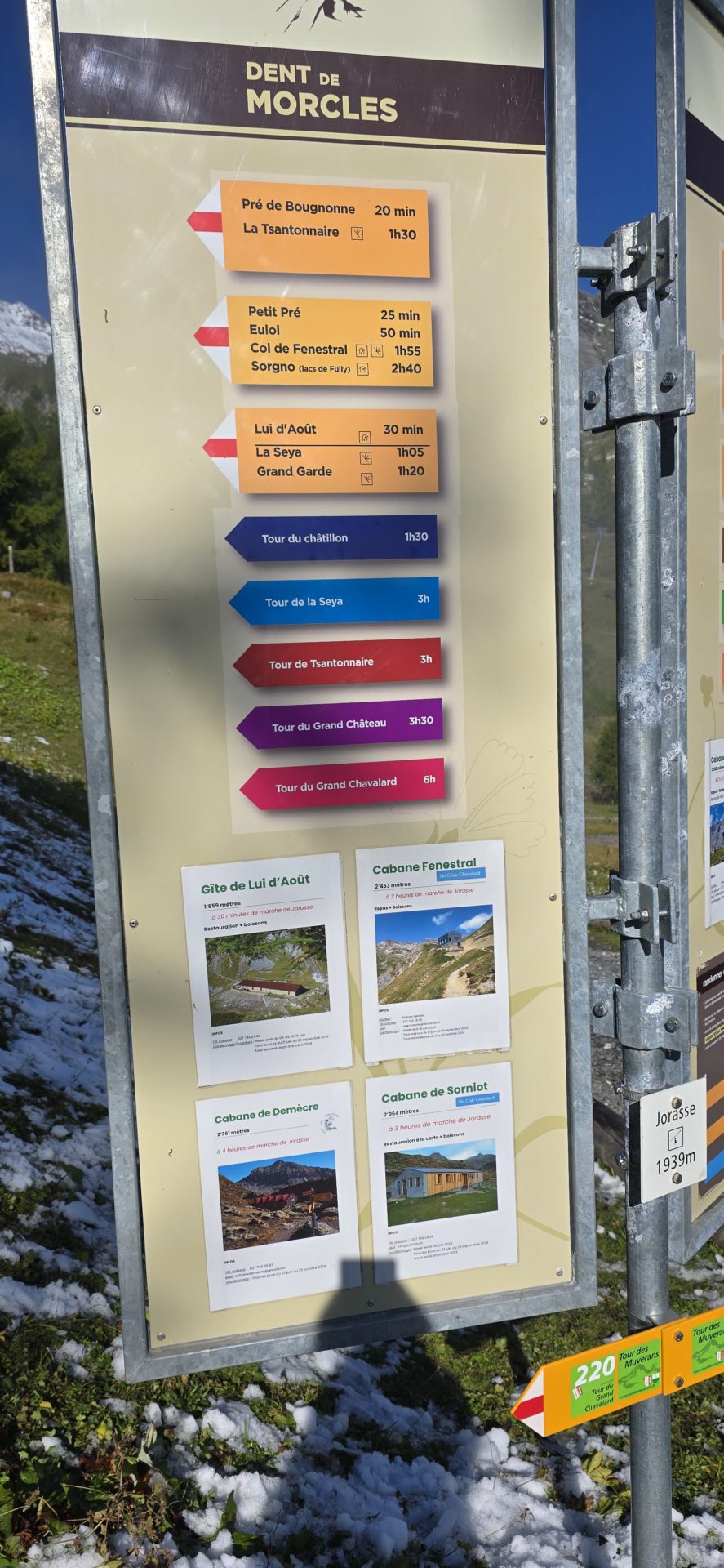 Le dĂ©but de la balade dĂ©marre doucement avec une montĂ©e en tĂ©lĂ©siĂšge jusquâĂ Jorasse. Si vous avez le Magic Pass, la montĂ©e sera gratuite sinon il faut compter 18.- pour un adulte (AR) et 11.- pour un enfant (AR â dĂšs 6 ans). Une fois arrivĂ©s au sommet, des panneaux explicatifs situĂ©s juste Ă cĂŽtĂ© du restaurant indiquent les itinĂ©raires de balades. Il suffit de suivre les indications « Tour de la Seya » et/ou « sentier botanique des Milles fleurs ». Le chemin dĂ©marre derriĂšre le restaurant par une montĂ©e dans la forĂȘt en direction du Sud.