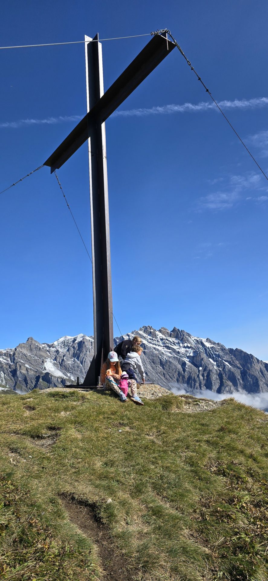 La fin du sentier se termine en dehors de la forĂȘt, sur les derniers mĂštres de la crĂȘte. On sent quâon arrive vraiment au sommet de la montagne, câest un sentiment trĂšs particulier. La Croix se dĂ©voile enfin sur le point culminant Ă 2â182m dâaltitude. Du haut de ses 8 mĂštres, elle domine la montagne, la station et mĂȘme toute la vallĂ©e du RhĂŽne. Depuis son pied, on peut admirer un panorama Ă 360° sur 35 sommets de plus de 4000 mĂštres. La vue est vraiment Ă©poustouflante. On a pris un petit snack au pied de la Croix en admirant le paysage avant de revenir sur nos pas. CâĂ©tait un moment vraiment exceptionnel.