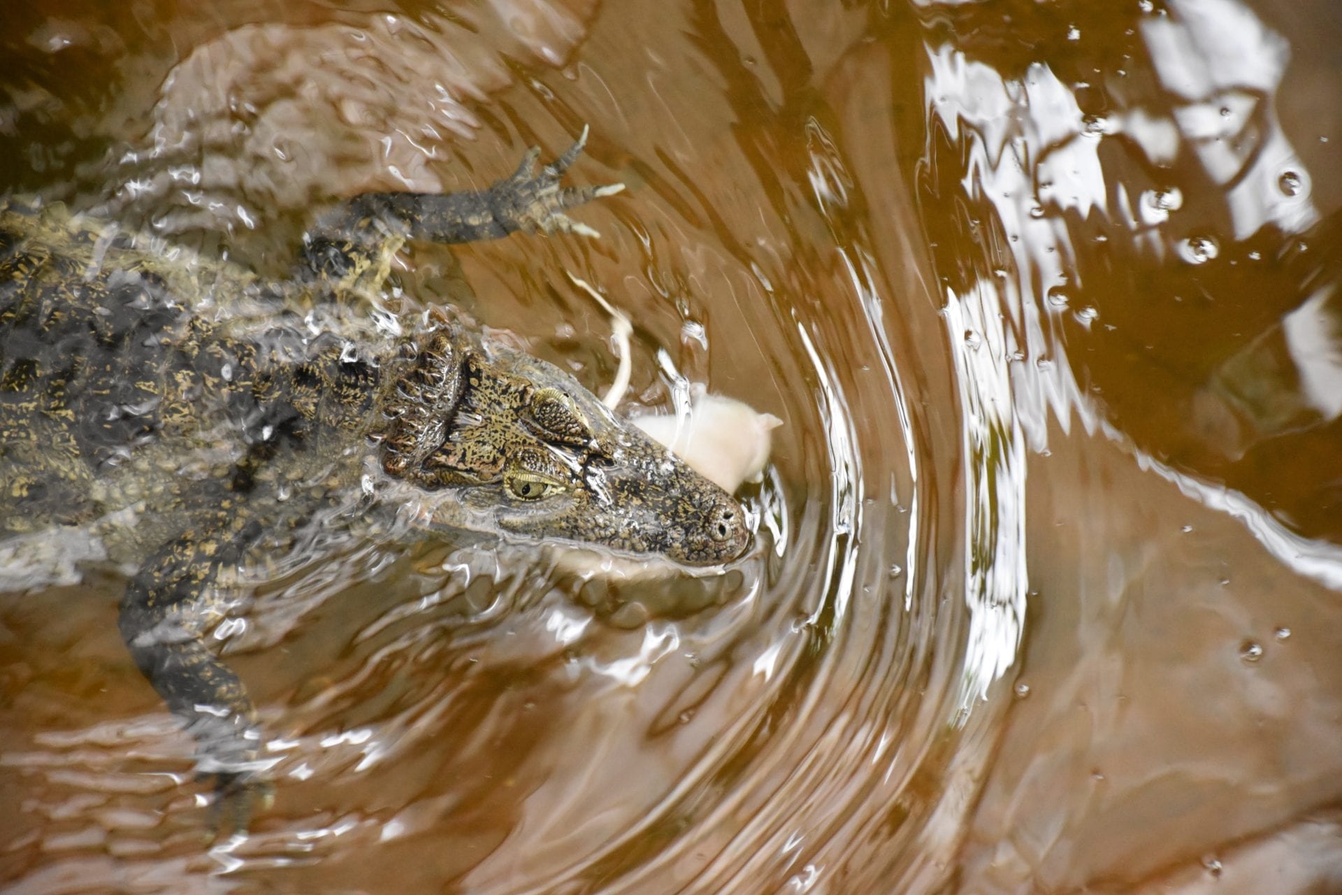 Ce nâest pas tout Ă fait des crocodiles qui se trouvaient en dessous de nous, en rĂ©alitĂ© nous Ă©tions en dessus dâun couple de caĂŻmans. Mais pour nos petits Lutins, « ces petits crocodiles » ont retenu toute leur attention. Nous avons rapidement remarquĂ© quâils devaient ĂȘtre observables de plus prĂšs depuis lâĂ©tage infĂ©rieur.