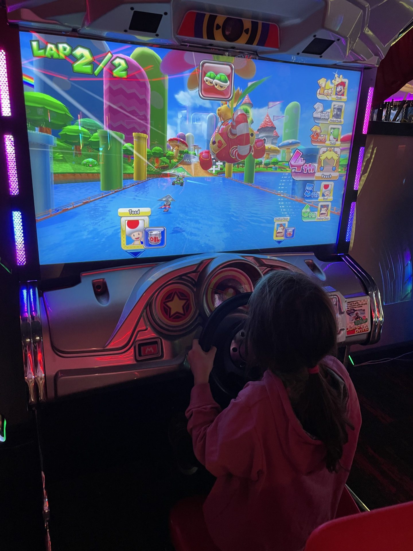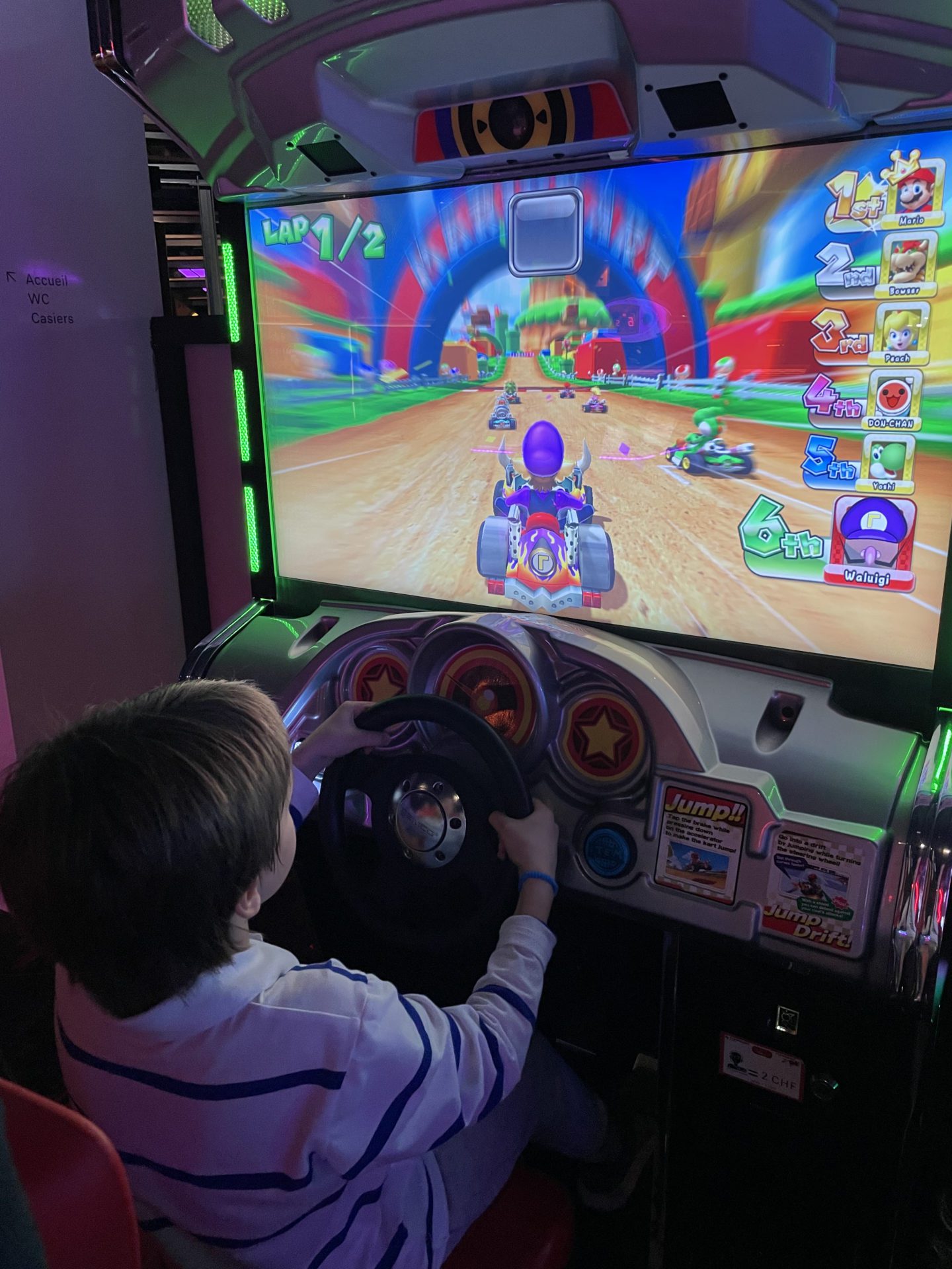 En arrivant, nos enfants ont tout de suite repĂ©rĂ© les jeux vidĂ©os de MarioKart! Ils Ă©taient trop heureux qu’on les laisse faire quelques parties chacun. Certains ont voulu Ă©galement testĂ© quelques autres jeux d’aracdes. Mon mari et notre ainĂ©e ont aussi essayĂ© le simulateur « Thyphoon » et ils se sont bien marrĂ©s.