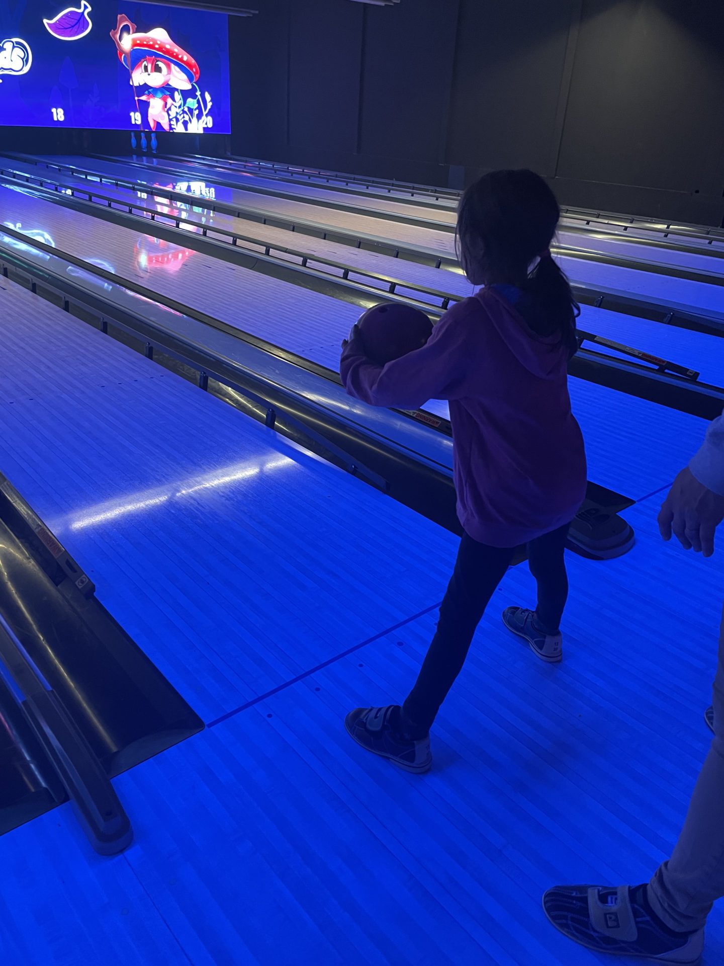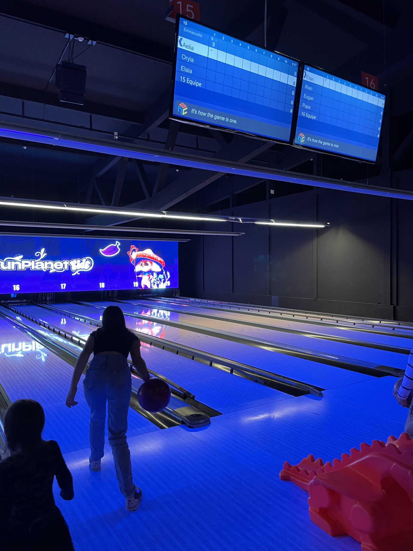 Puis nous avons  fait un bowling en famille. C’est un loisir qu’on apprĂ©cie de pouvoir faire tous ensemble car en fonction du niveau de chacun on peut l’adaptĂ©. Les deux plus jeunes ont utilisĂ©  les « rampes  » pour lancer leurs boules et les moyens ont demandĂ© Ă mettre les barriĂšres. Ainsi tout le monde s’amuse sans trop de frustration. Comme nous sommes beaucoup, nous avons pris deux pistes cĂŽte Ă cĂŽte et avons fait « les filles contre les garçons »!