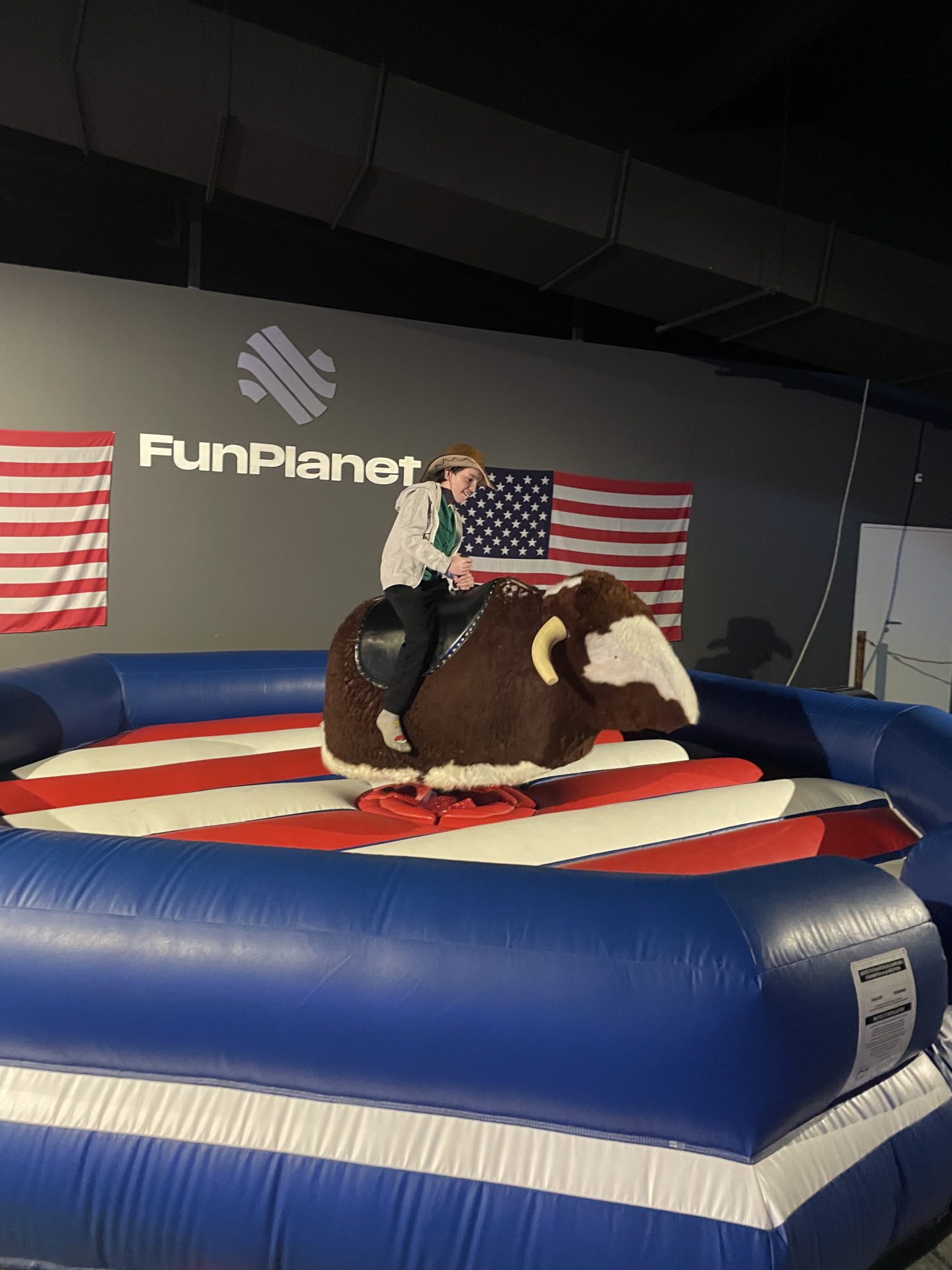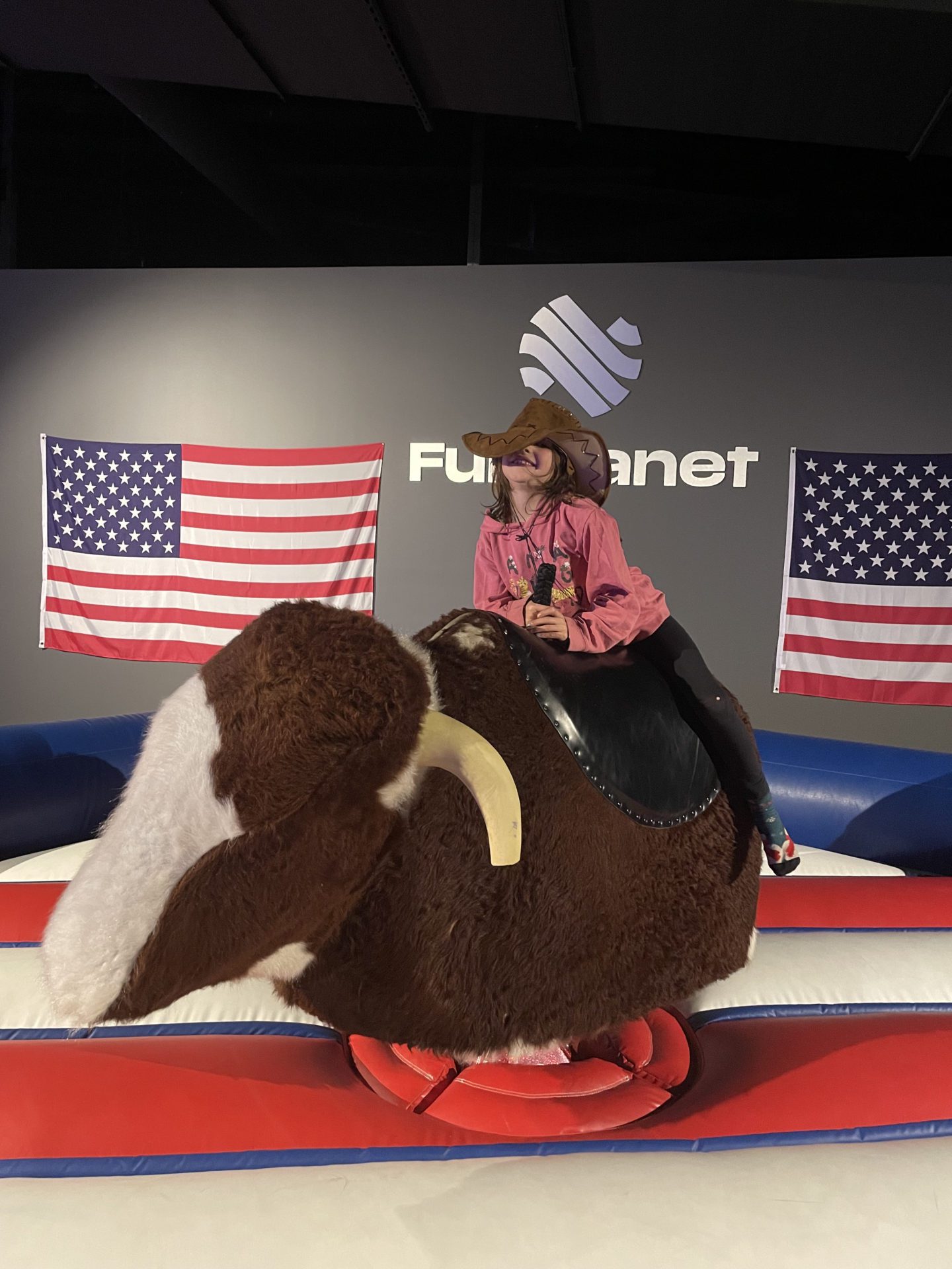 Une fois les petits ventres bien remplis nous sommes montĂ©s Ă l’Ă©tage du dessus. LĂ se trouve encore quelques activitĂ©s. Nous avons fait un tour de rodĂ©o mĂ©canique, c’est toujours un dĂ©fi de tenir le plus longtemps possible ! Mais qu’est ce qu’on rigole.