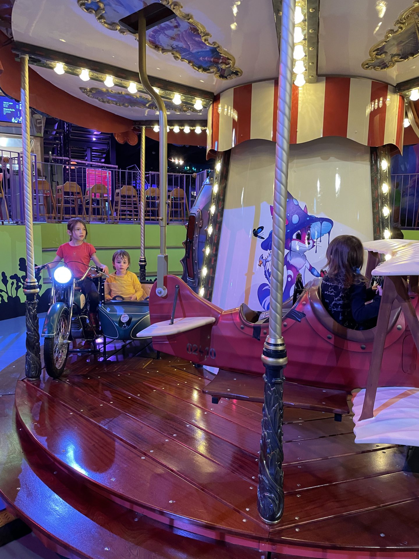 De notre cĂŽtĂ©, aprĂšs cette petite pause, nous nous sommes sĂ©parĂ©s en deux groupes. Mon mari est allĂ© avec les plus grands faire un goolfy (mini-golf) suivi d’une session de Magic Cave (spĂ©lĂ©ologie, pour laquelle il faut Ă©galement rĂ©servĂ© un crĂ©neau horaire). De mon cĂŽtĂ©, avec les plus jeunes, nous avons testĂ© plusieurs petites activitĂ©s. Nous avons commencĂ© par le Parcours Gonflable , suivi de l’Accro Fun , du Jungle Park et du Carrousel de Jules Vernes. Nous avons aussi passĂ© un petit moment dans le Fun City et dans le Digital Experience.  Au centre du site se trouve aussi un grand toboggan, celui-ci a Ă©galement plu Ă nos petits Lutins. Mais le temps passe vite… aprĂšs toutes ces dĂ©couvertes nous nous sommes retrouvĂ©s en famille pour faire l’activitĂ© Magic car, qui est en faite des auto-tamponneuses. Pour la plupart de nos enfants c’Ă©tait une premiĂšre et on a tous bien rigolĂ©.