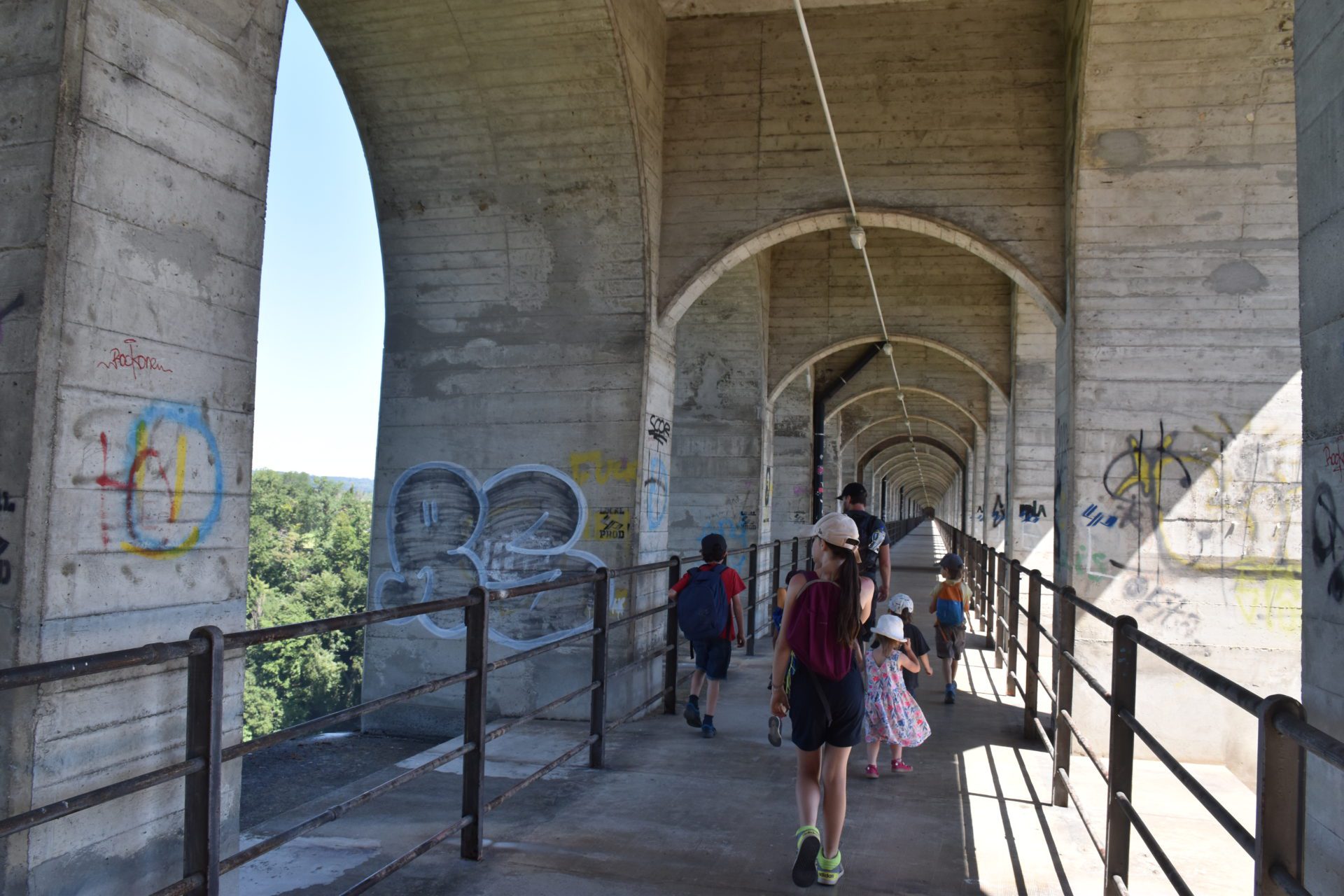 AprĂšs plus de 2h sur place, nous reprenons la route en sens inverse et empruntons le mĂȘme sentier que pour venir. Les Lutins sont ravis de passer Ă nouveau par le Viaduc de Grandfey.