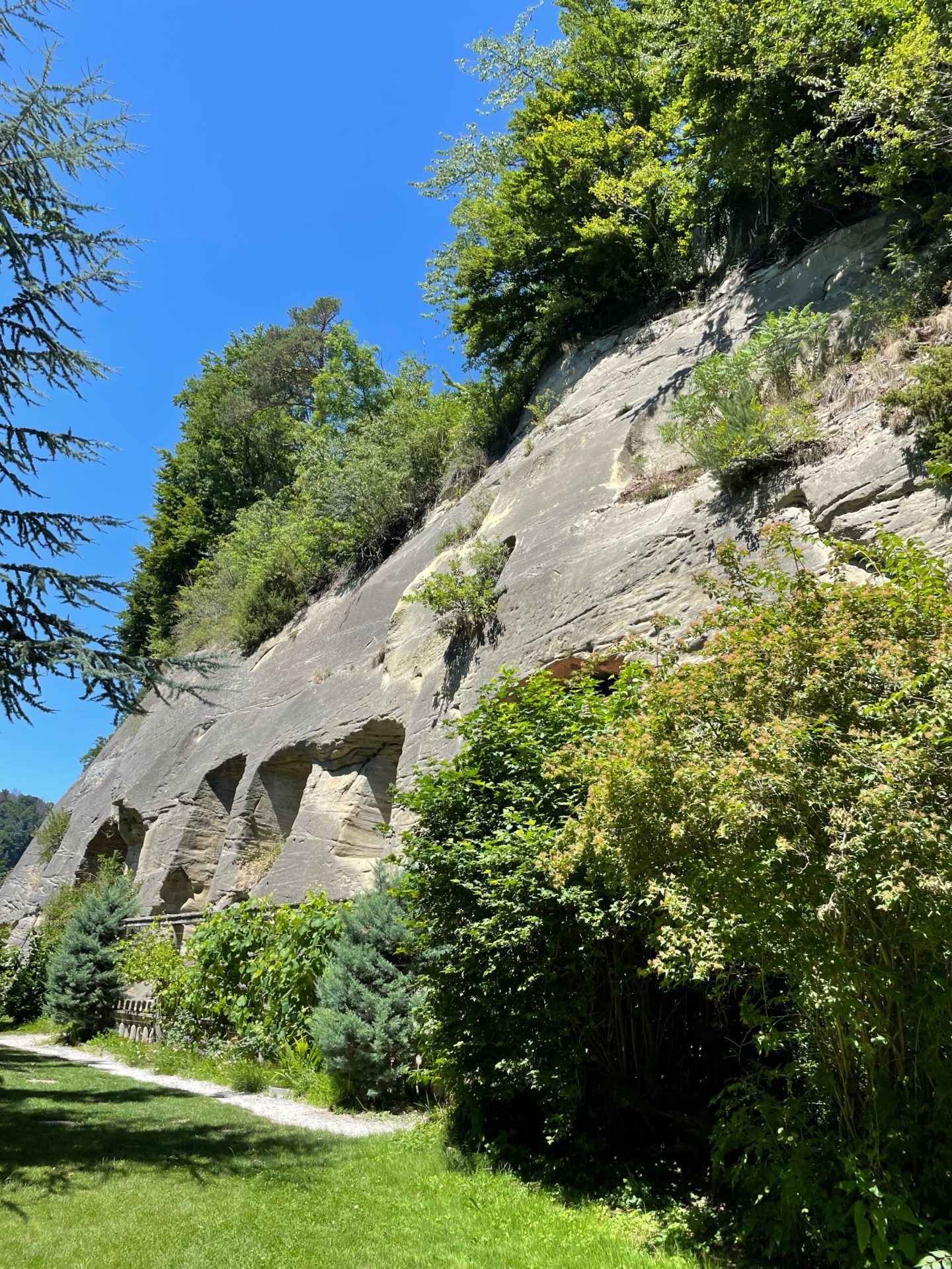 Ce lieu surprenant et magnifique a Ă©tĂ© creusĂ© dans les falaises surplombant le lac artificiel de Schiffenen. En 1448, des Ă©crits parlent du hameau de RĂ€sch et de lâhabitat dâun ermite. Puis en 1609, un ermite est mentionnĂ© dans ce lieu de maniĂšre plus officielle. Mais câest entre 1680 et 1708 que deux ermites le façonnent et lui donnent lâaspect que nous pouvons admirer aujourdâhui. ComposĂ© de plusieurs piĂšces, dont une petite chapelle, il a une longueur totale de 120m.