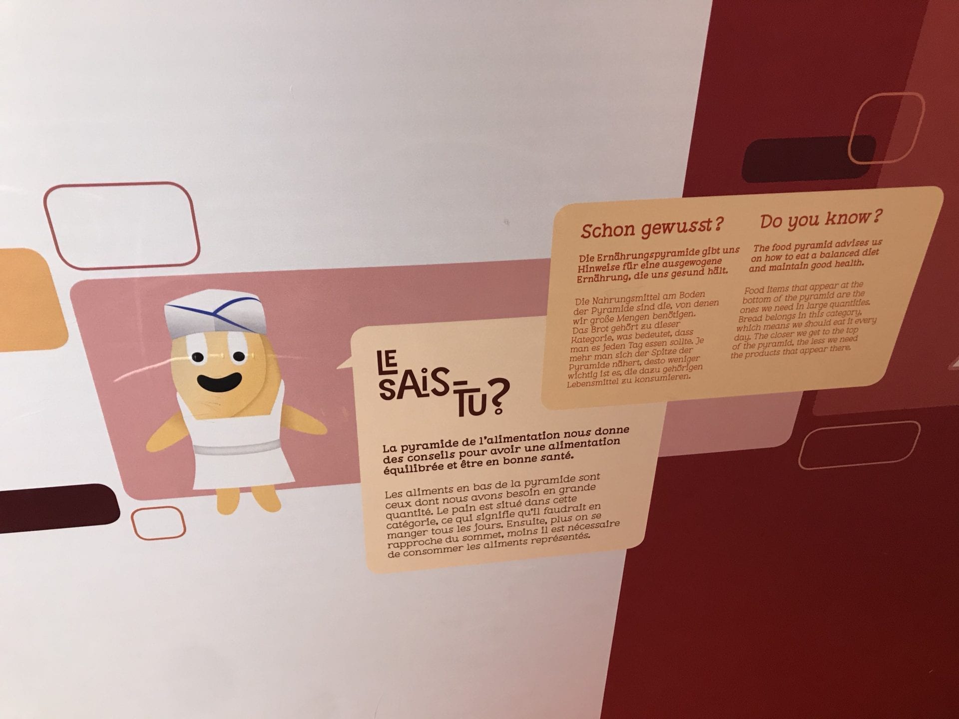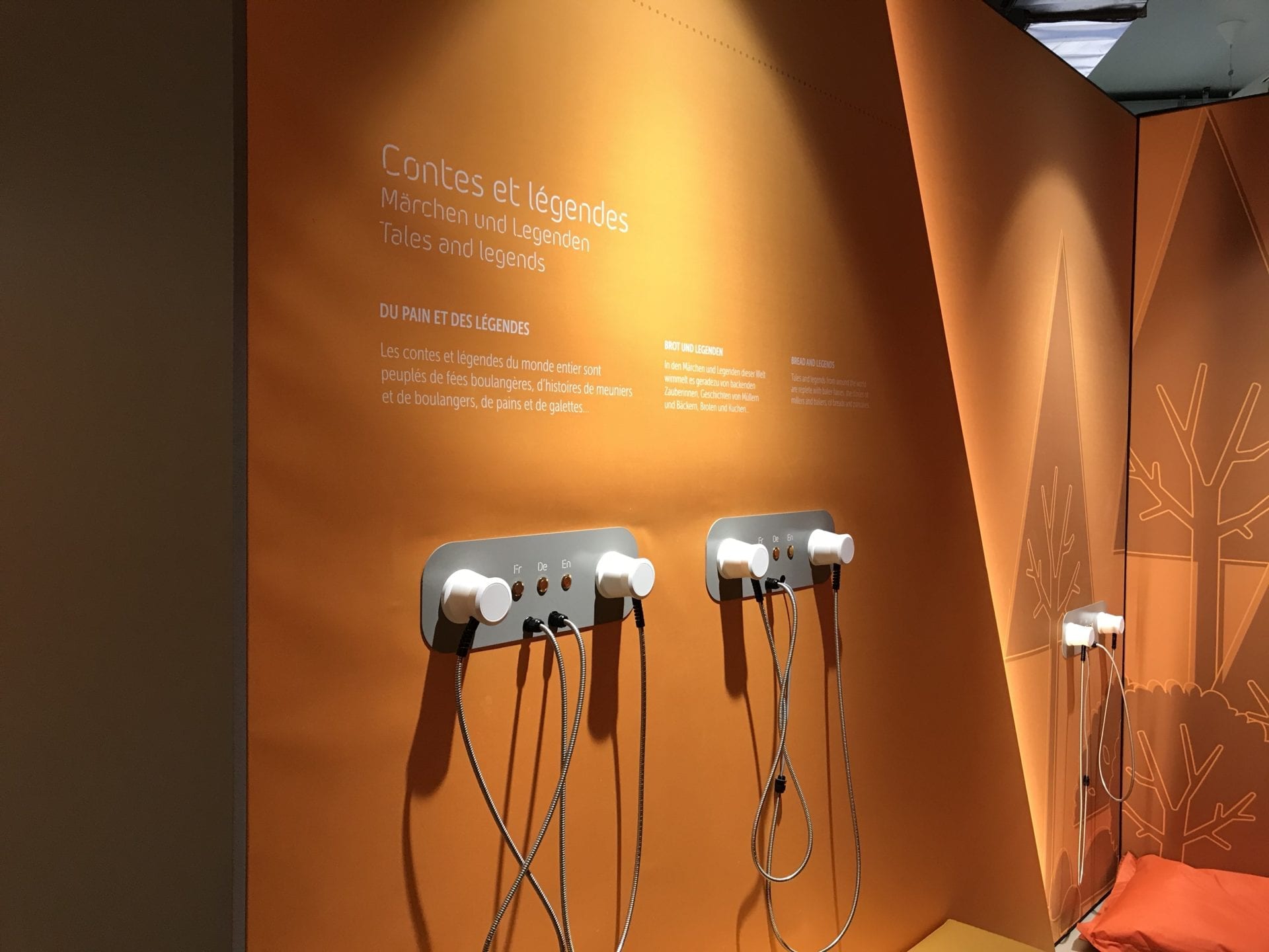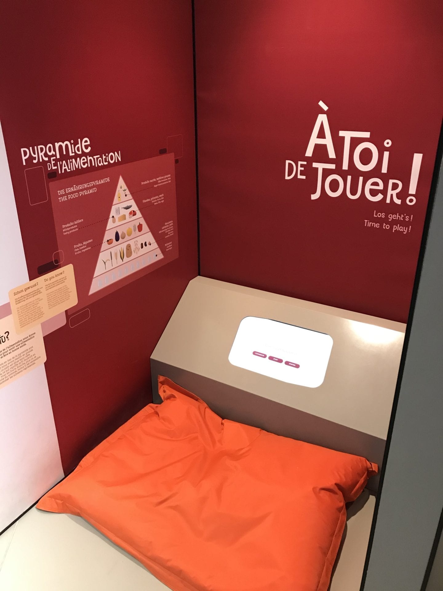 Bien installé sur de gros poufs colorés, Petit Poulet peut écouter des contes et légendes autour du pain et jouer sur des écrans tactiles situés à sa hauteur pour découvrir la fabrication du pain ou encore l’équilibre alimentaire.