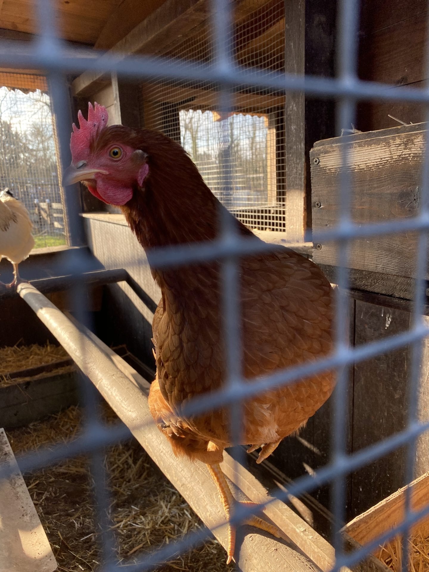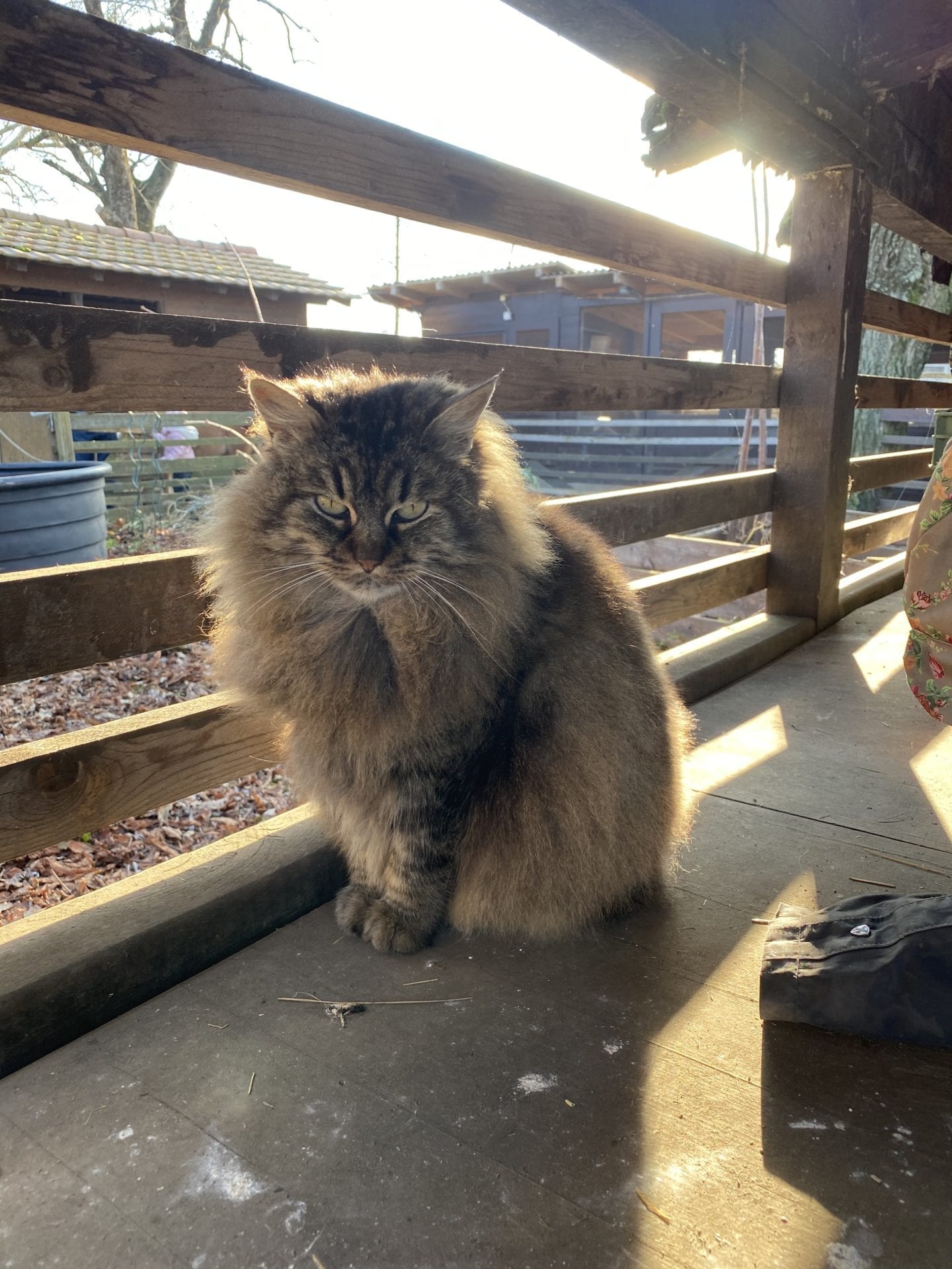 Nous bifurquons vers les clapiers contenant divers espĂšces d’oiseaux, coqs, poules, dindons et faisans. Un beau chat au poil long surveille paisiblement tout ce beau monde.