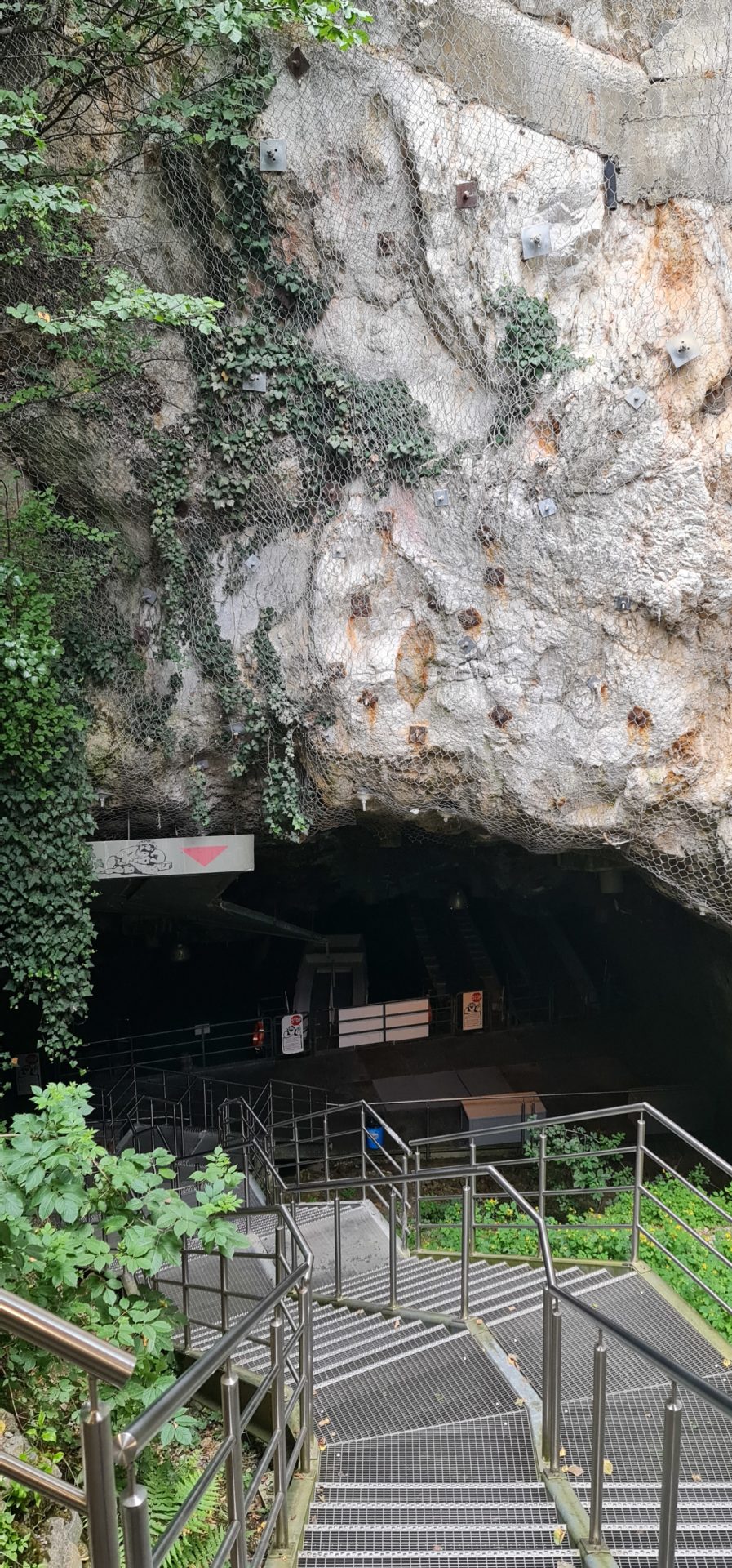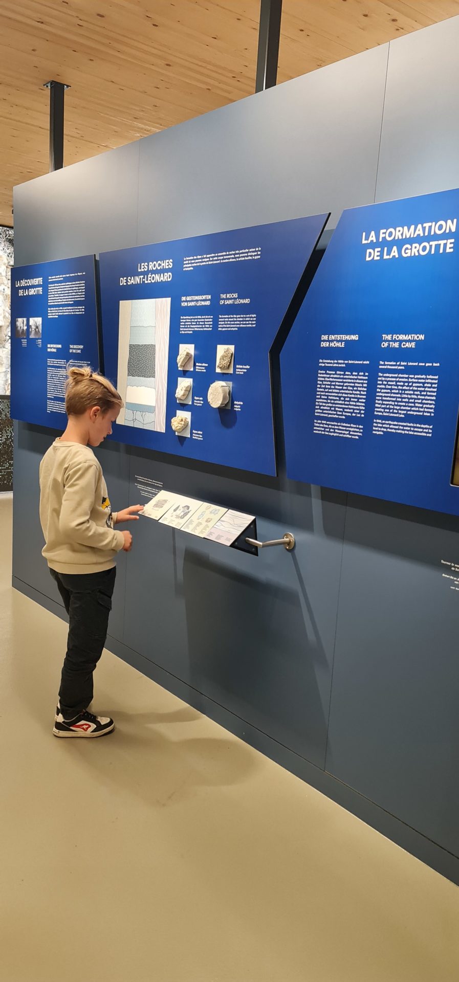 Pour dĂ©couvrir le Lac souterrain, il est nĂ©cessaire de planifier sa visite. Les rĂ©servations sont obligatoires et trĂšs facilement rĂ©alisables en ligne. Il faut choisir son crĂ©neau horaire et arriver 15 minutes avant la visite. Comme les 15 minutes de marge sont dĂ©jĂ  comptĂ©es dans l’horaire annoncĂ©, nous arrivons sur place finalement avec 30 minutes d’avance. C’est l’occasion de jeter un Ɠil Ă  la boutique de souvenirs qui proposent vraiment de jolis objets. On reste captivĂ©s par les nombreuses pierres, en pendentifs ou en bracelets. On profite aussi de s’assurer qu’on est bien Ă©quipĂ©s pour la visite et justement.. on retourne rapidement chercher une couche de vĂȘtements supplĂ©mentaires. La responsable de l’accueil nous explique, effectivement, que l’air dans la grotte est Ă  15 degrĂ©s et l’eau Ă  11 degrĂ©s (toute l’annĂ©e). Une fraĂźcheur certainement bienvenue les jours de canicule mais qui peut aussi ternir la visite si l’on grelotte tout au long de la prĂ©sentation du guide. En attendant notre tour, on profite de la petite zone didactique qui explique la formation de la grotte. À la minute du dĂ©part de la visite, le guide arrive et nous ouvre les barriĂšres pour descendre quelques escaliers de pierre et rejoindre l’entrĂ©e de la mystĂ©rieuse grotte.