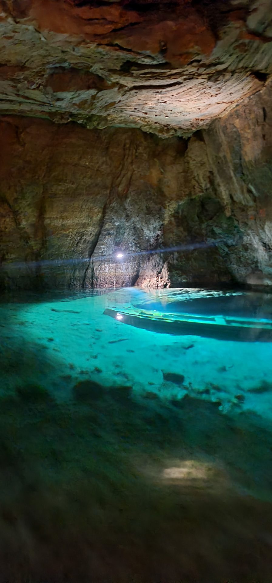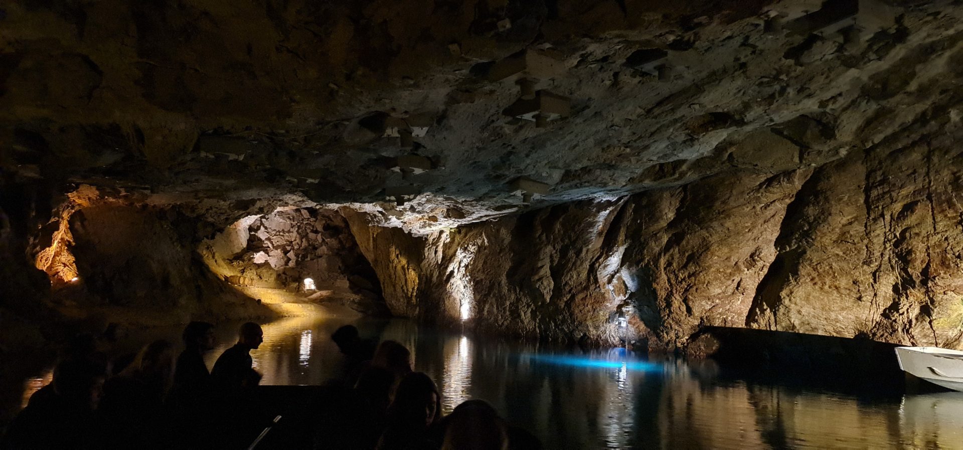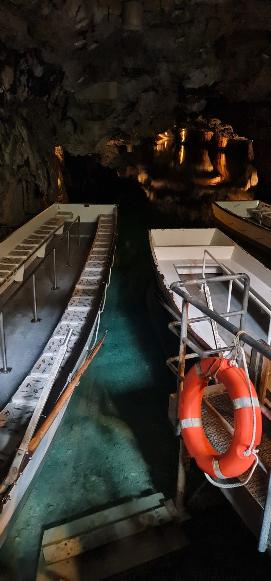 On grimpe tous, un Ă  un, dans l’une des trois grandes barques amarrĂ©s au bout du lac. L’air devient soudainement  beaucoup plus humide et frais. Les garçons ressentent aussi le changement d’ambiance et trĂ©pignent Ă  l’idĂ©e de grimper dans l’embarcation. Une fois installĂ©s, le guide se prĂ©sente en plusieurs langues et la visite dĂ©marre. On s’enfonce doucement dans la pĂ©nombre de la grotte alors que certains points lumineux Ă©clairent l’eau translucide du lac et bord de la grotte. Notre gondolier rame avec douceur et sĂ©rĂ©nitĂ© tout en nous expliquant l’histoire de la grotte, les premiĂšres explorations mais aussi l’éboulement qui condamne la cavitĂ© aprĂšs 260 mĂštres, alors que la grotte ( partie non-ouverte au public) se poursuit encore sur plus d’un kilomĂštre de long. Je suis vraiment Ă©bahie par la beautĂ© des lieux, les parois rocheuses tantĂŽt illuminĂ©es et la puretĂ© de l’eau. « Elle est potable ! », nous glisse le guide.