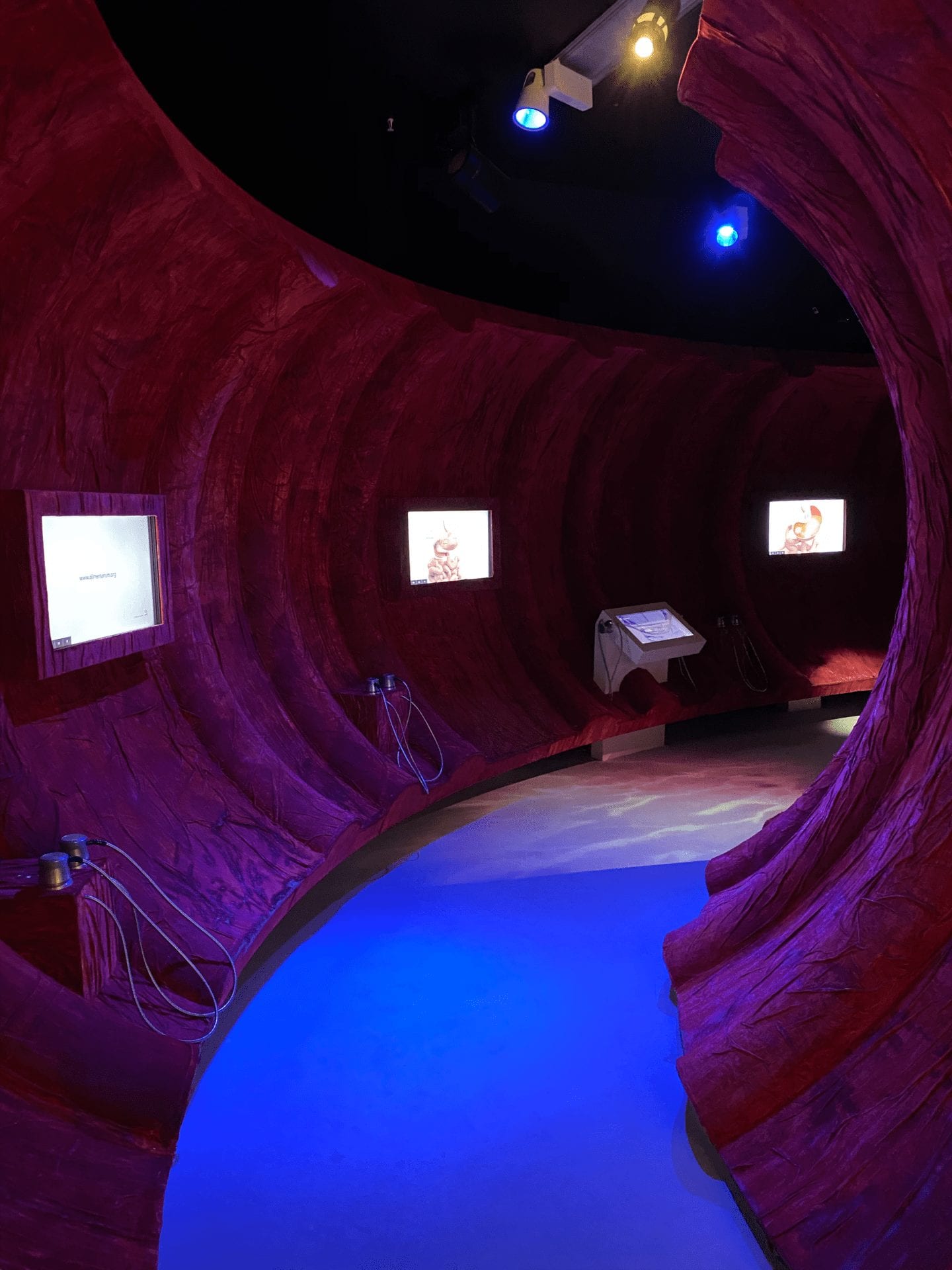 Dernière étape et dernier étage : l’aliment et le corps, ou “pourquoi mangeons nous?”. L’atmosphère est passionnante, entre les jeux de lumières et l’aménagement d’un tunnel ressemblant à un bout de tube digestif. Petit Poulet a beau de pas savoir lire, il observe avec attention.