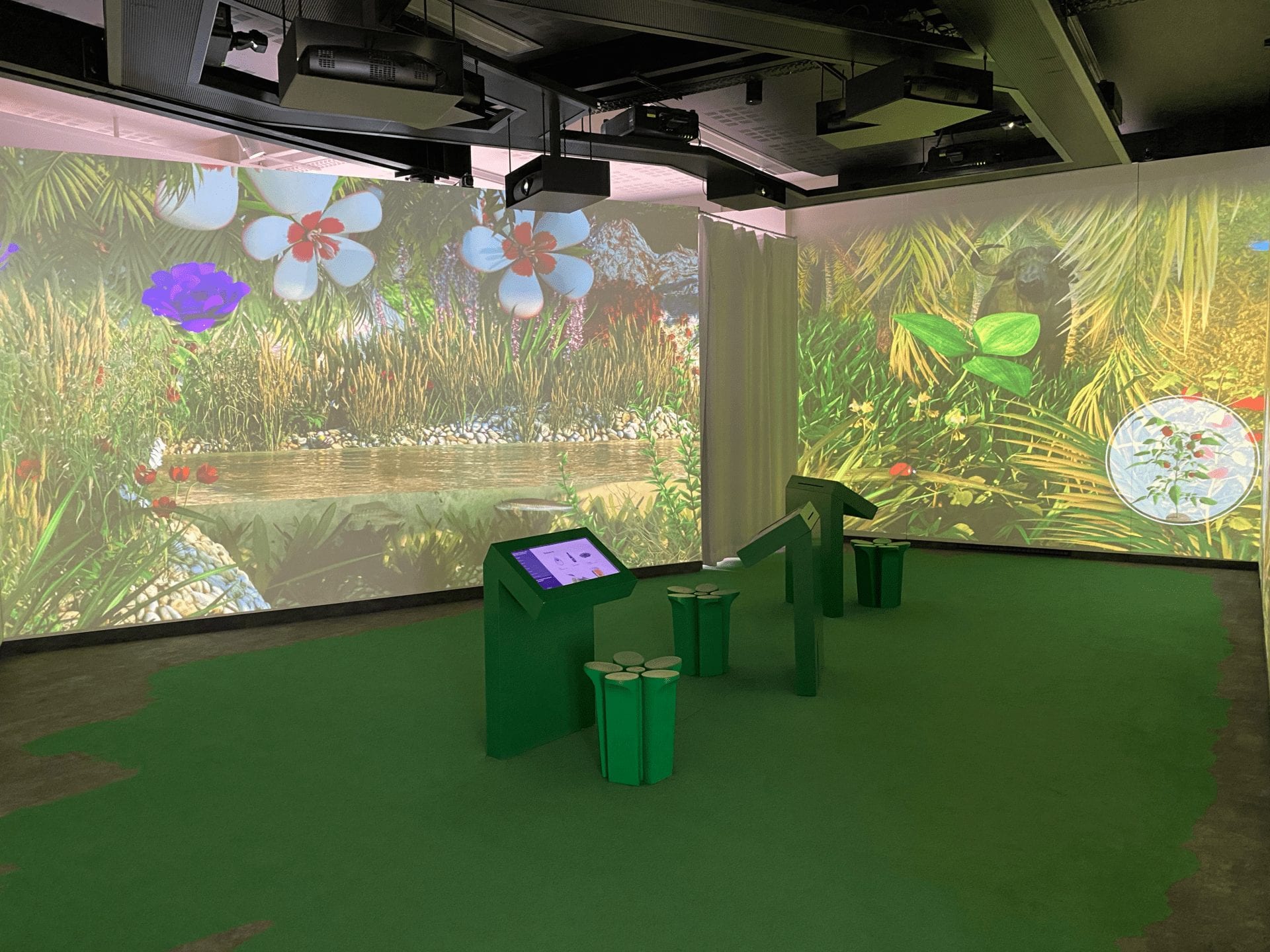 Nous nous retrouvons rapidement dans une salle dont les murs sont couverts de projections naturelles. C’est très joli… Il s’agit en fait de murs interactifs qui nous proposent de découvrir la composition de ce que l’on consomme (un poisson qui devient poisson pané, ou du houblon qui constitue la bière).