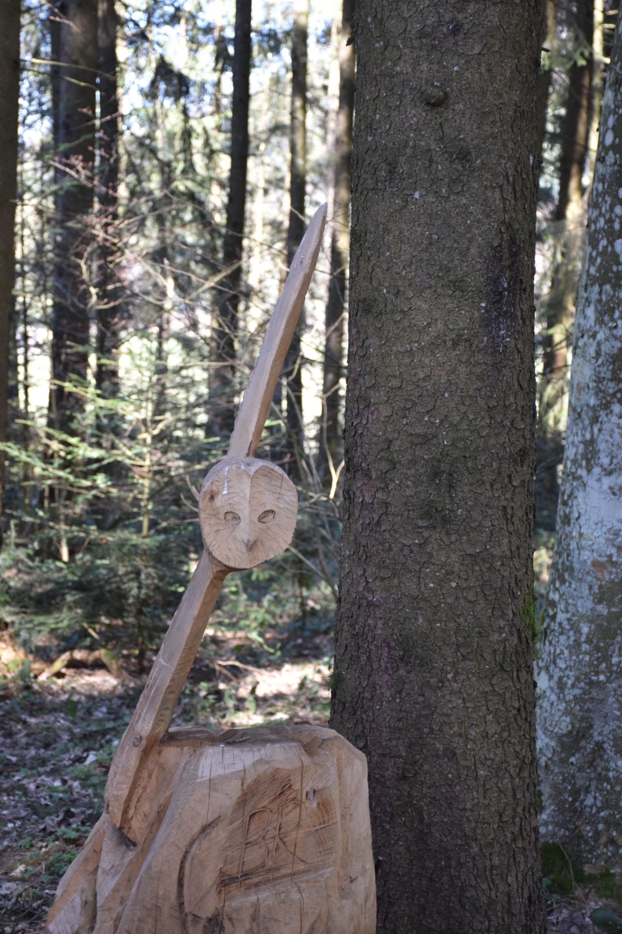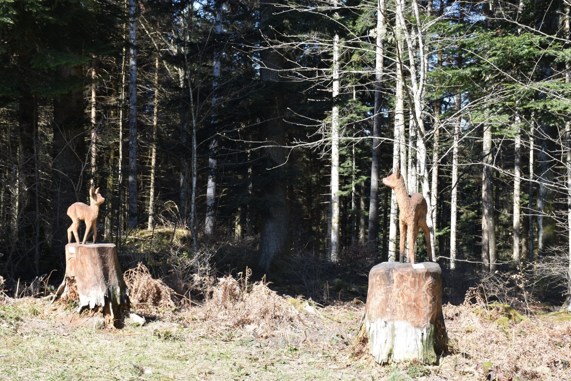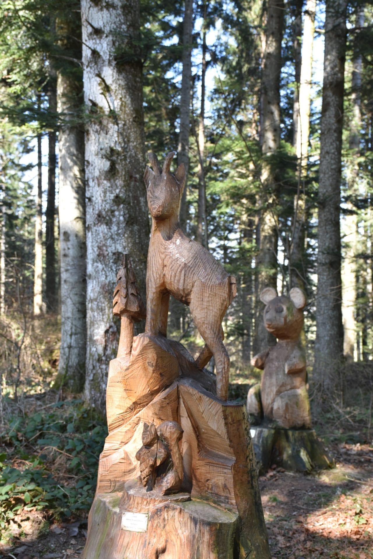 Et nous voilĂ tous les huit en route sur ce paisible sentier forestier accompagnĂ©s dâun doux soleil caressant nos joues et du chant des oiseaux. DĂšs les premiers mĂštres parcourus nous avons pu admirer lâextraordinaire travail des artistes. Les sculptures se suivent de maniĂšre rĂ©guliĂšre, offrant un vrai rĂ©gal pour nos yeux. Nous avons cheminĂ© entre bouquetins, Ă©cureuils, hiboux, biches et tant dâautres animaux. Mais la faune nâest pas la seule Ă ĂȘtre reprĂ©sentĂ©e. Nous y avons croisĂ© des personnages connus ou complĂštement anonymes ainsi quâune multitude dâobjets de la vie quotidienne. Dâautre sculptures sont plus abstraites mais nous ont impressionnĂ©s par leur Ă©laboration.