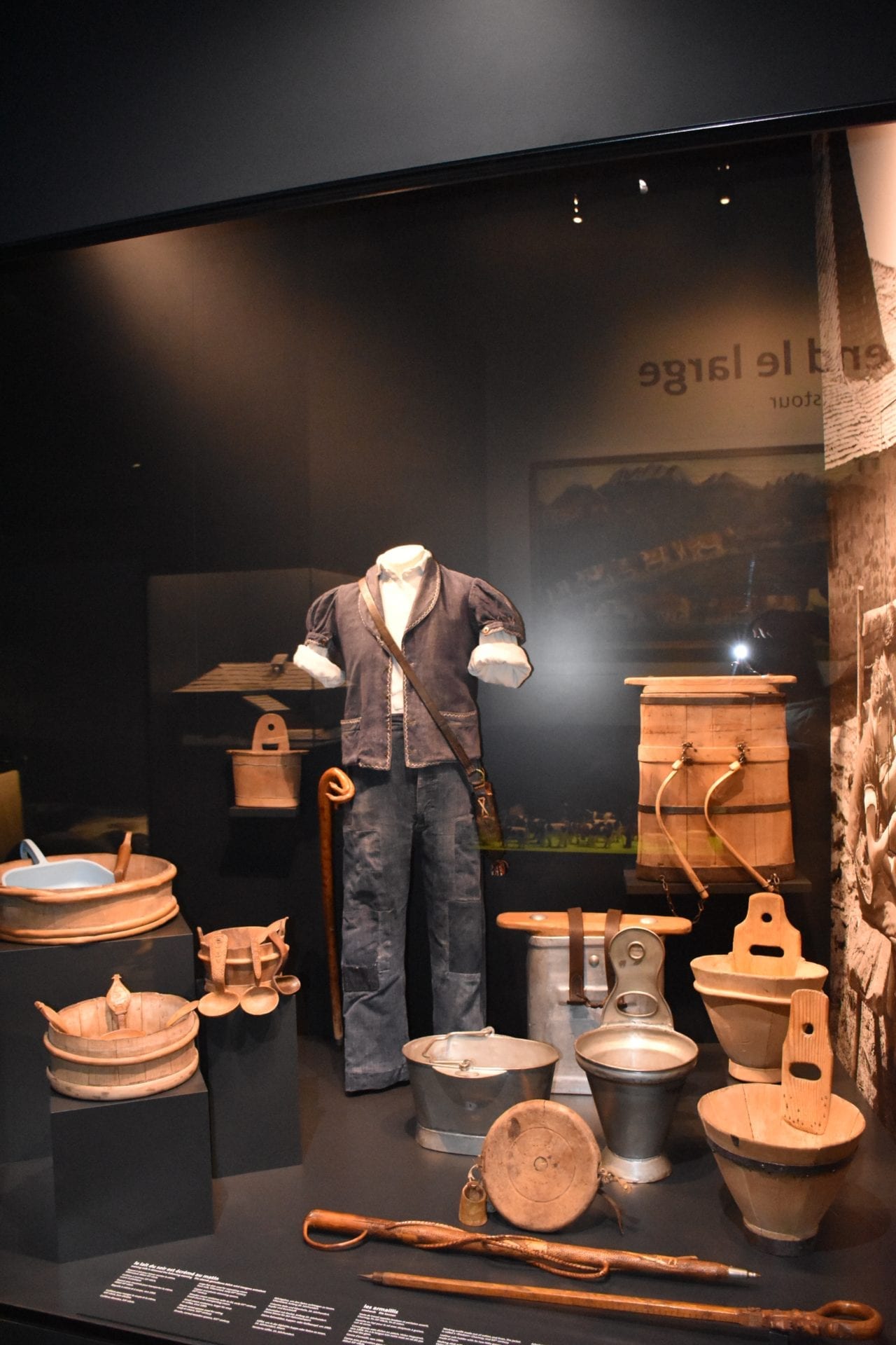 AprĂšs avoir payĂ© nos entrĂ©es, nous descendons le grand escalier pour nous rendre dans la partie « musĂ©e » du bĂątiment. Celui-ci est divisĂ© en deux grands espaces. Il y a lâespace contenant lâexposition permanente et un espace pour les expositions temporaires. Nous entamons notre visite par lâexposition permanente. Celle-ci se divise en plusieurs thĂšmes. Nous commençons par le sujet du fromage, passons ensuite par lâartisanat et lâindustrie dans la rĂ©gion, puis nous nous arrĂȘtons dans la vie quotidienne dâun foyer avant dâentrer dans lâhistoire de la ville de Bulle. Sâen suit un rapide passage expliquant les frontiĂšres Ă lâĂ©poque de Moyen-Ăąge, puis nous en apprenons plus sur la vie religieuse de la GruyĂšre avant de terminer la visite avec le thĂšme des mĂ©dias.