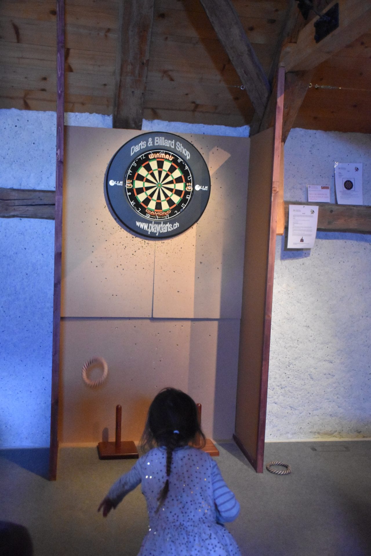 Puis nous poursuivons notre visite en nous rendant dans l’une de leur piĂšce favorite. La salle de jeux, avec anneaux Ă  lancer, flĂ©chette, flipper, babyfoot et d’autres, moins connus, mais tout aussi amusants. Nous avons passĂ© un trĂšs long moment dans cette salle. Parents et enfants de tout Ăąge testent les jeux, essayent et rĂ©essayent (Oui je veux rĂ©ussir Ă  lancer cet anneau en mĂ©tal sur le taureau !!!). Nous avons finalement dĂ» mettre un terme Ă  ce chouette moment car personne ne voulait s’en aller (et oui bon j’ai enfin rĂ©ussi Ă  accrocher ce fichu anneau !).