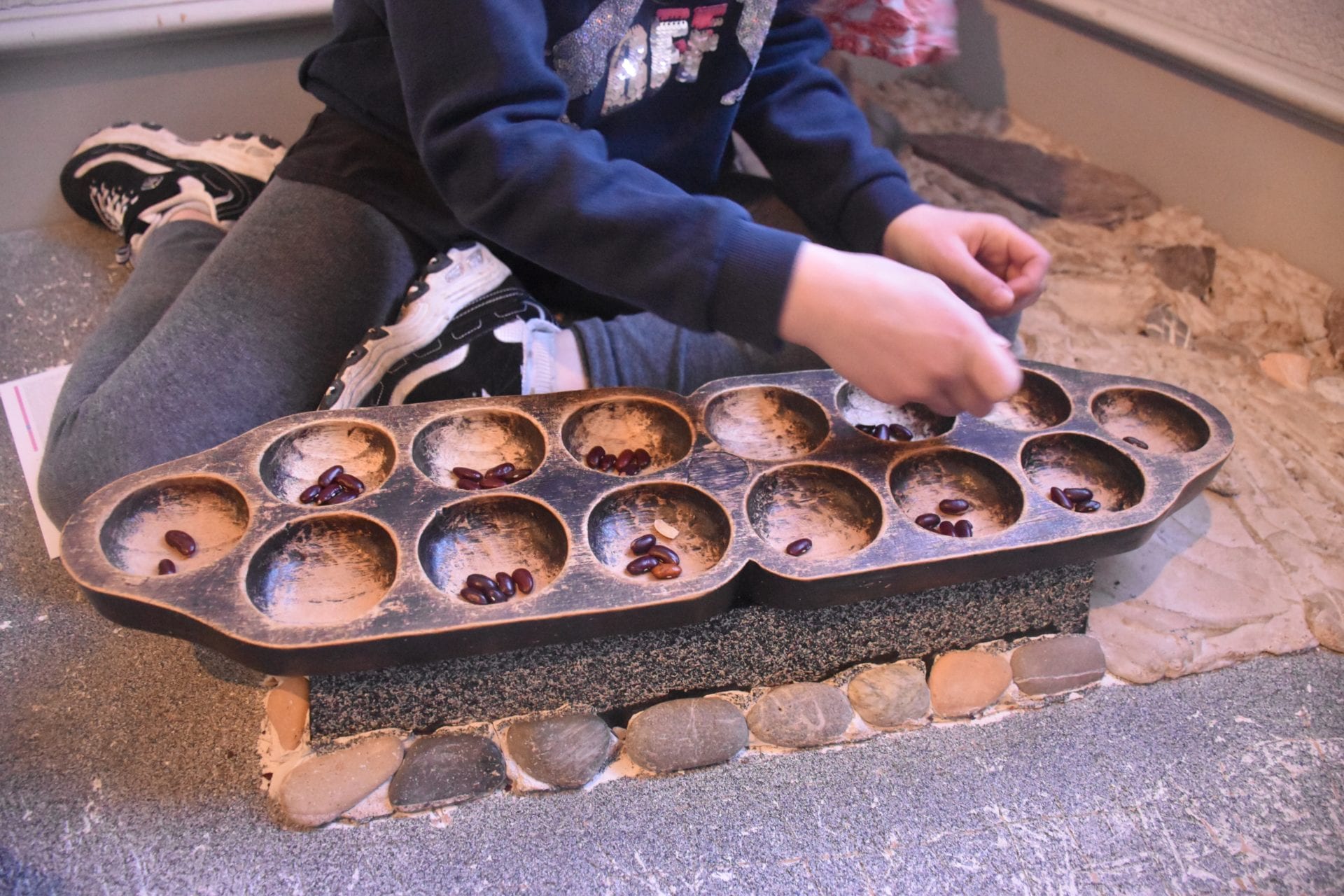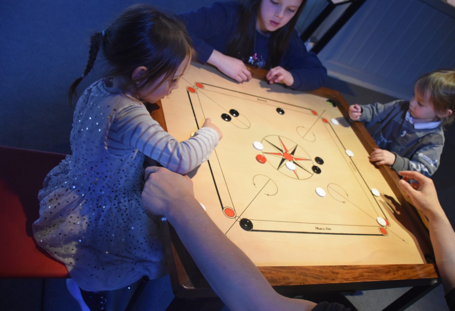 Une fois que nous avons fini d’arpenter l’ensemble des piĂšces du premier Ă©tage (et tester une bonne partie des jeux proposĂ©s !), nous avons emprunter l’escalier pour nous rendre Ă  l’étage. Nous dĂ©couvrons d’autres types de jeux et nous sommes ravis de pouvoir faire dĂ©couvrir Ă  nos Lutins le jeu du carambole/ Karom. Ce jeu auquel nous jouions petit. Quel plaisir de replonger en enfance, les Lutins crochent immĂ©diatement sur le principe.