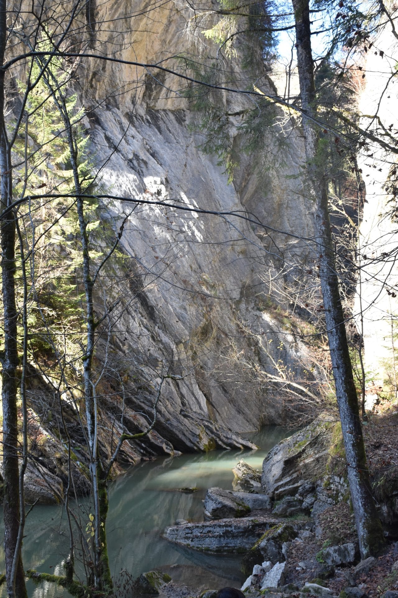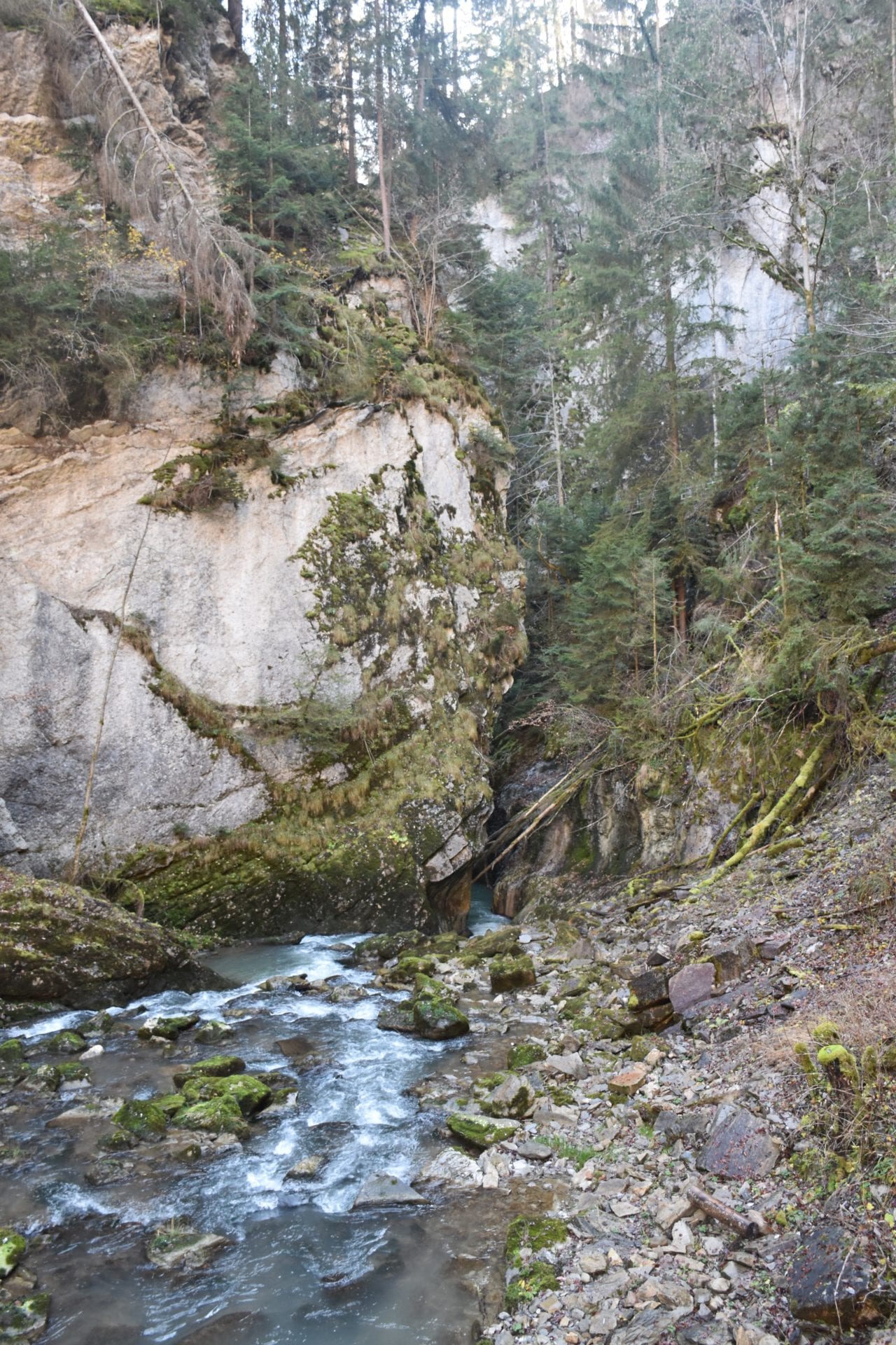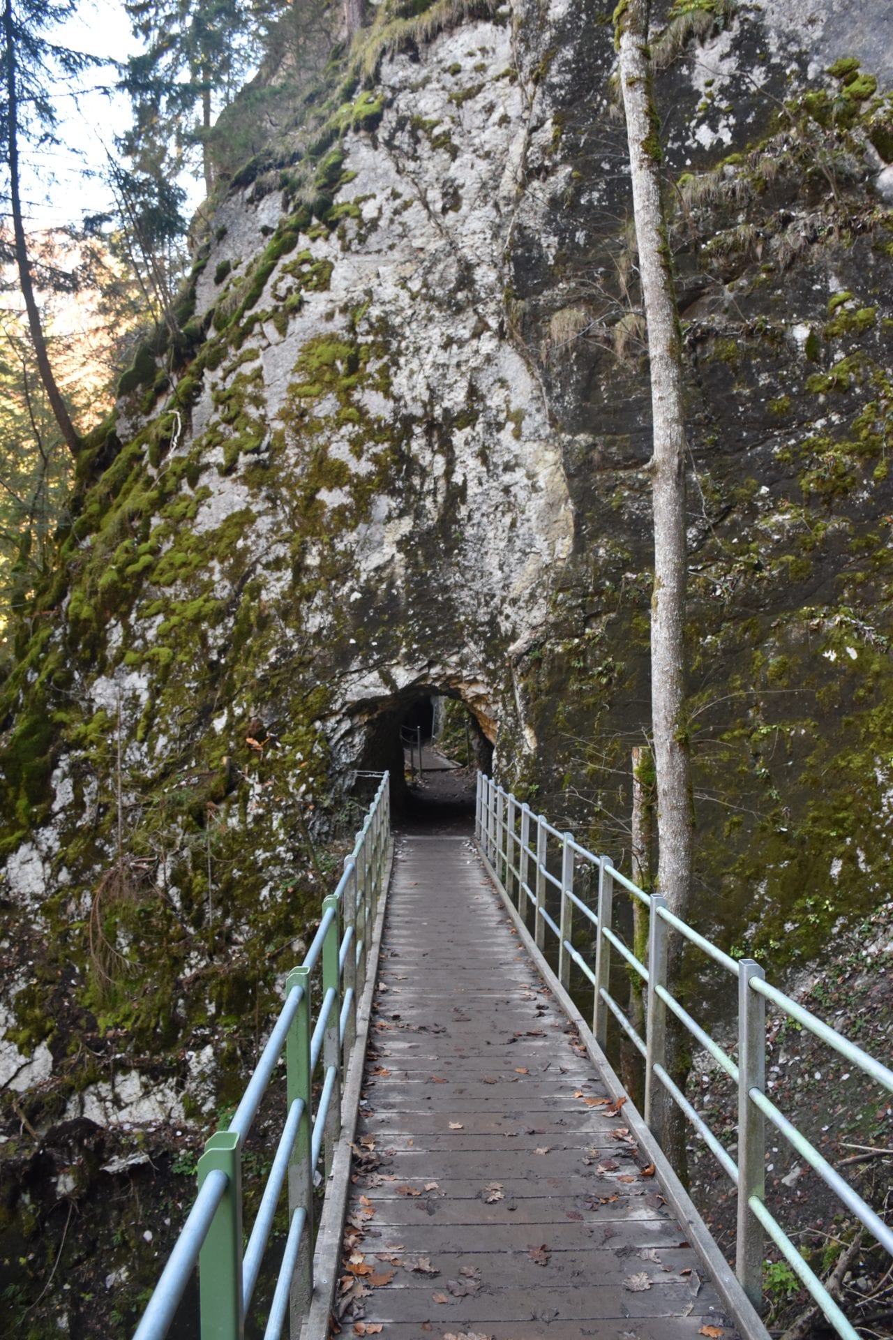 Au terme de quelques minutes de marche sur le sentier forestier nous traversons une petite passerelle et atteignons l’entrée des Gorges de la Jogne. Le décor change radicalement et nous nous retrouvons en bas d’abruptes falaises au fond desquelles s’écoule la rivière. Le chemin devient beaucoup plus étroit et nous invite à entrer dans un tunnel sombre, creusé dans la roche et surplombant de quelques mètres la Jogne. Au milieu du tunnel se trouve une ouverture nous offrant un magnifique spectacle de cette nature sauvage. Puis nous poursuivons entre passerelles et petits sentiers serrés. Bien que certains passages soient un peu plus étroits, l’ensemble de l’itinéraire reste tout de même plutôt facile et accessible avec des enfants, mais toujours sous haute surveillance.