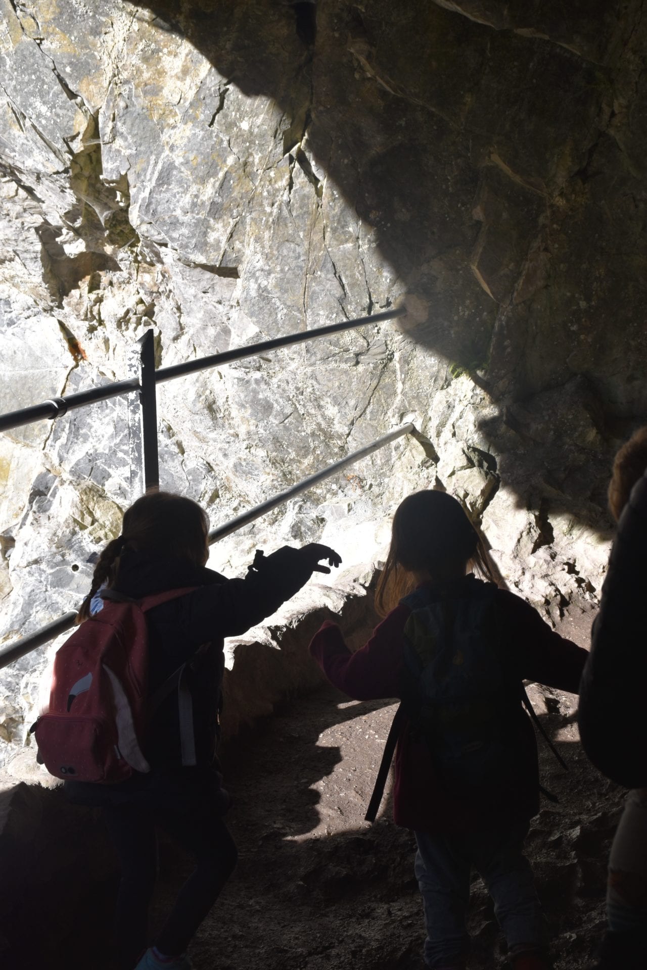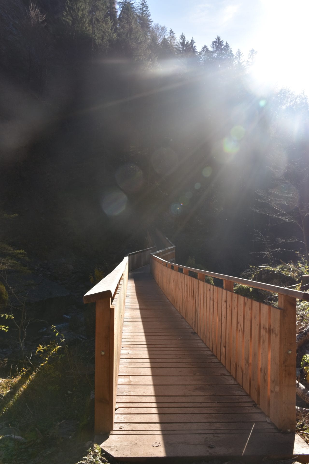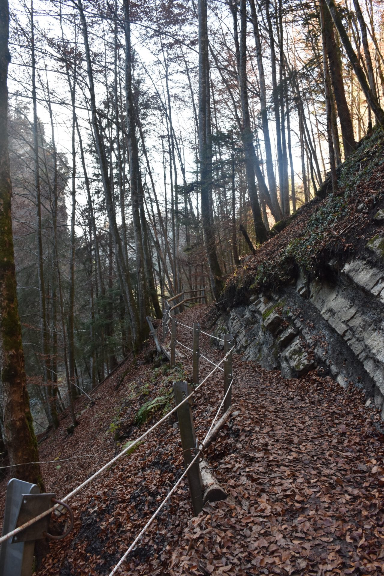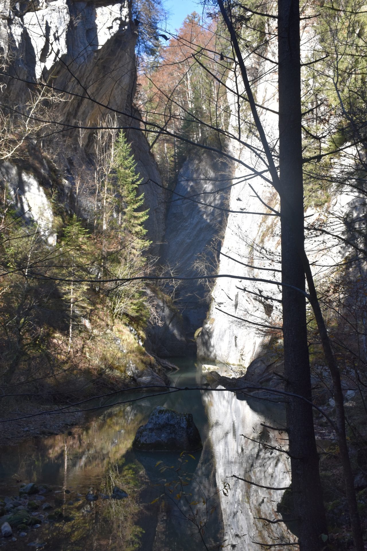 Au terme de quelques minutes de marche sur le sentier forestier nous traversons une petite passerelle et atteignons l’entrée des Gorges de la Jogne. Le décor change radicalement et nous nous retrouvons en bas d’abruptes falaises au fond desquelles s’écoule la rivière. Le chemin devient beaucoup plus étroit et nous invite à entrer dans un tunnel sombre, creusé dans la roche et surplombant de quelques mètres la Jogne. Au milieu du tunnel se trouve une ouverture nous offrant un magnifique spectacle de cette nature sauvage. Puis nous poursuivons entre passerelles et petits sentiers serrés. Bien que certains passages soient un peu plus étroits, l’ensemble de l’itinéraire reste tout de même plutôt facile et accessible avec des enfants, mais toujours sous haute surveillance.