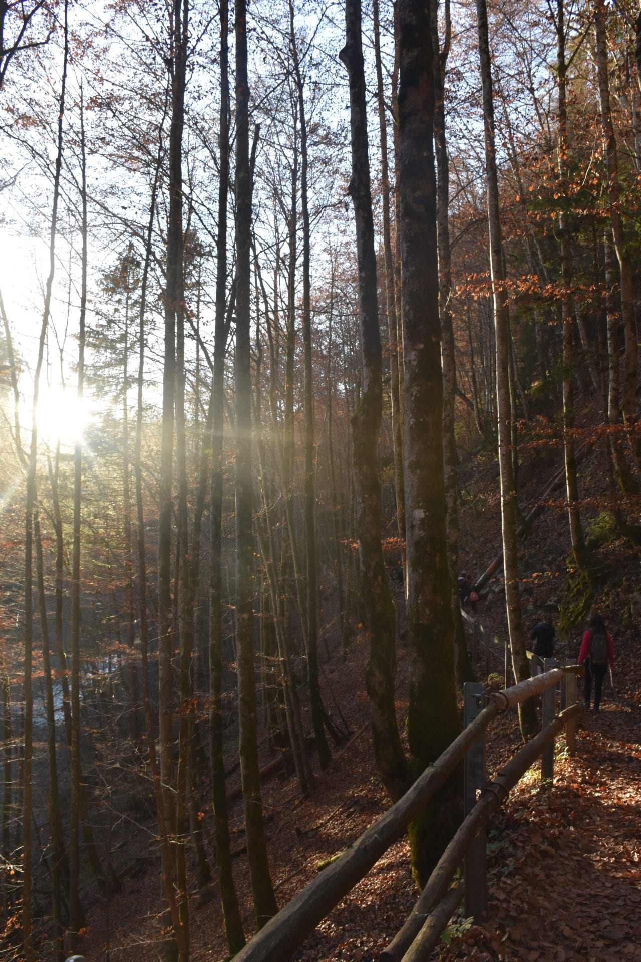 Étant donné que l’heure de midi était déjà passée, nous avons débuté notre excursion avec un pique-nique. Juste à l’entrée du sentier forestier qui mène aux gorges, se trouve un lieu de pique-nique aménagé avec tables et bancs. L’endroit est idéal, légèrement en hauteur, et tout proche du parking.
