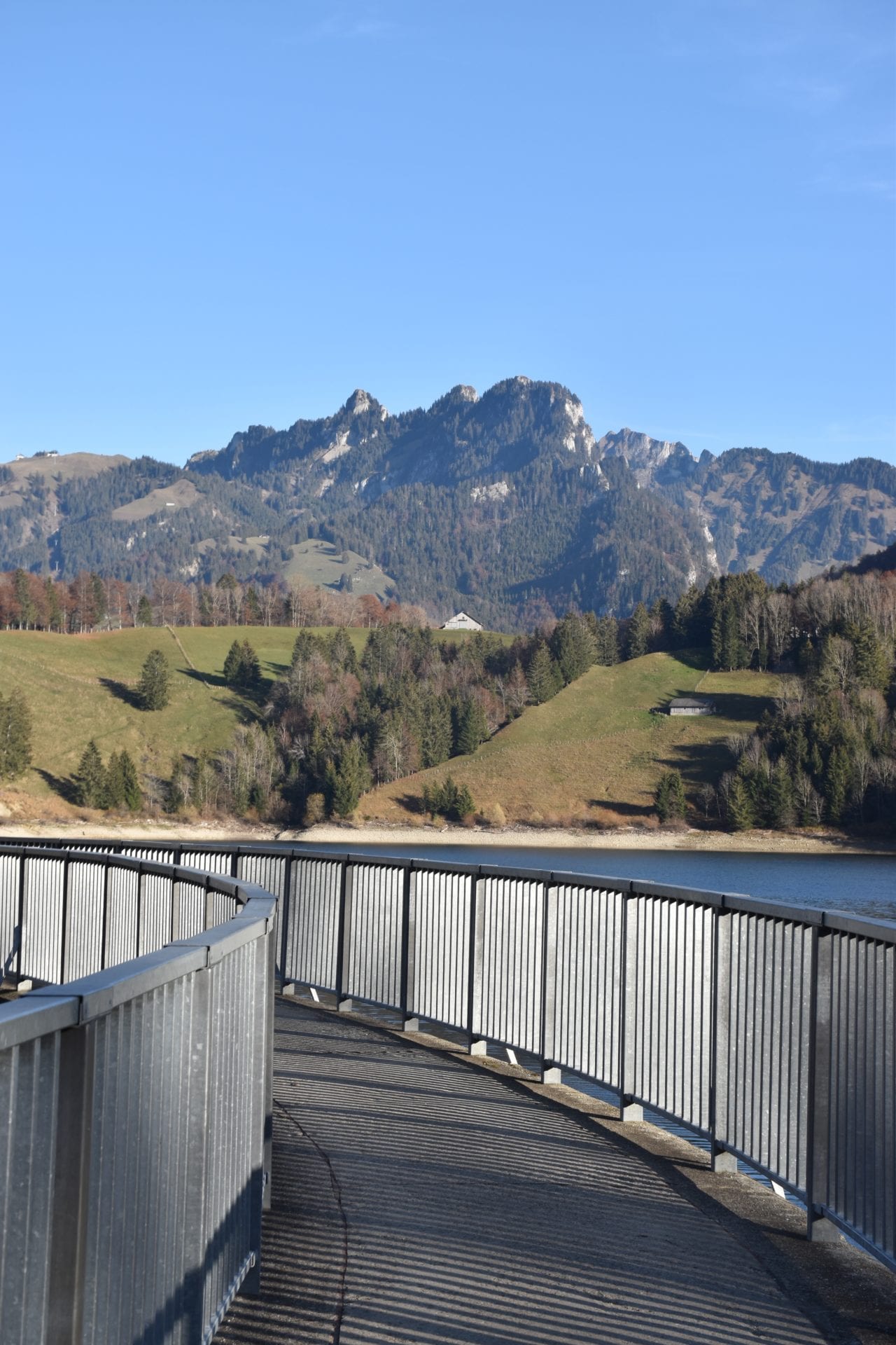 Nous longeons un immense rocher puis nous arrivons à nouveau dans un tunnel, plus sombre que le premier il est impressionnant pour les plus jeunes. A peine sorti de ce tunnel que nous en reprenons un autre, mais beaucoup plus court. Et là, à nouveau, le paysage change et offre un beau dépaysement. On peut admirer la rivière, plus large, s’enfiler et presque disparaitre, dans les gorges que nous venons de traverser. Un peu plus loin, une dernière passerelle nous emmène au bas d’un raide et long escalier, qu’il faut gravir courageusement pour atteindre notre but… le barrage de Montsalvens ! Mais quelle joie d’arriver en haut. Un lieu de pique-nique y est aménagé nous offrant l’opportunité d’une pause bien méritée. Nous en profitons également pour nous rendre sur le barrage, qui offre d’un côté une vue vertigineuse sur l’installation hydraulique et sur la vallée de la Jogne et de l’autre côté un très joli point de vue sur la région de Charmey. Lac et montagnes sont au rendez-vous dans ce paysage !