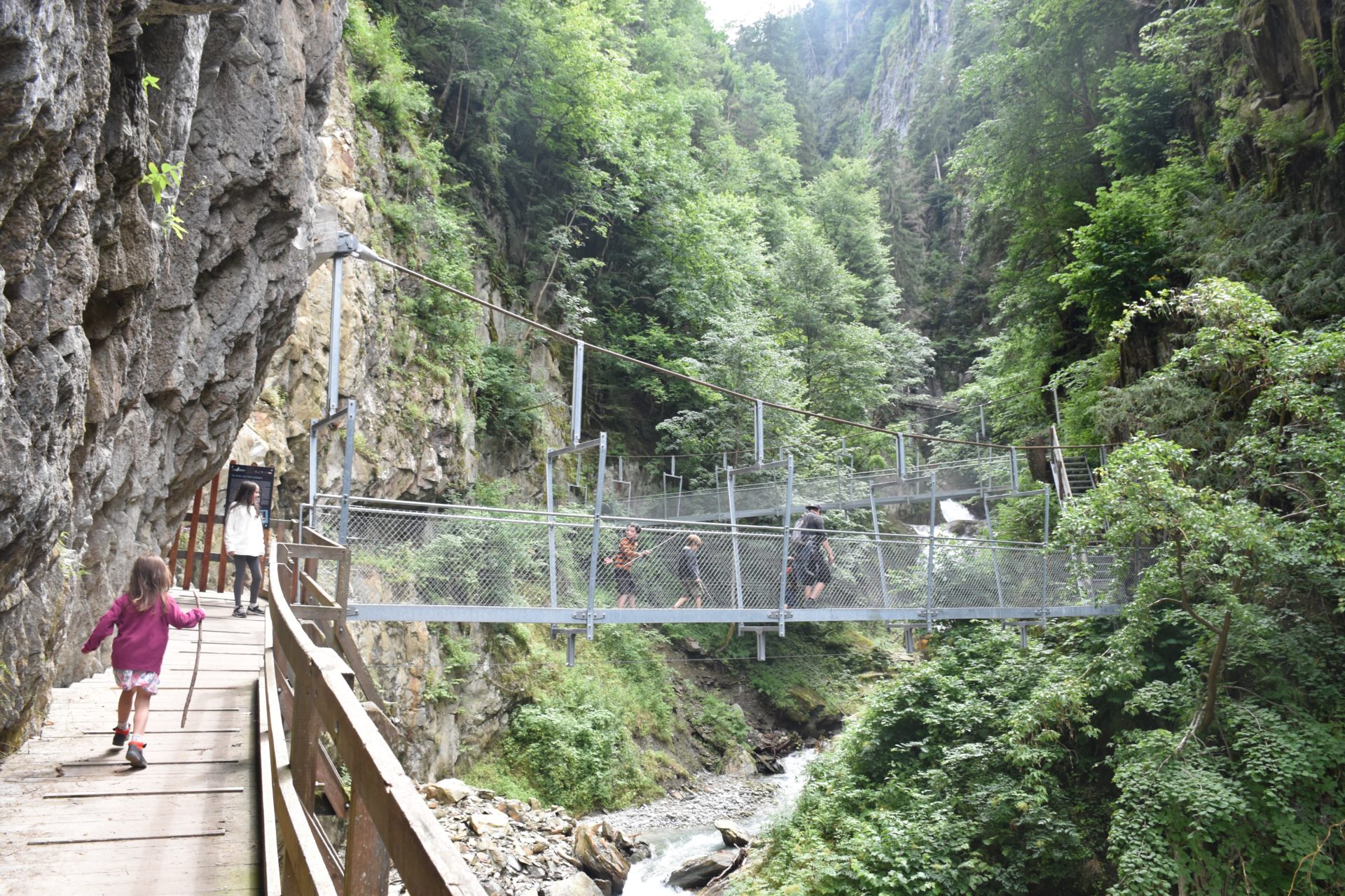 Une fois le portail d’entrée franchi, nous voici sur le sentier des gorges, à coté de nous le bruit de la rivière et le fracas de l’eau sur les rochers nous mettent tout de suite dans le bain. Puis, après ces premiers mètres sur le sentier nous entamons la montée. Escaliers et passerelles nous font survoler ces magnifiques gorges. La succession des cascades impressionne les Lutins et les passages sur les passerelles en métal au-dessus de la rivière ont de quoi nous donner le vertige.
