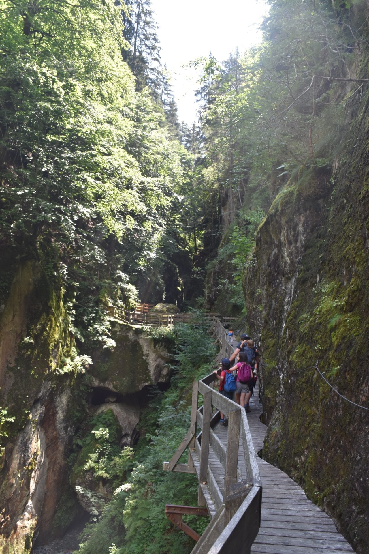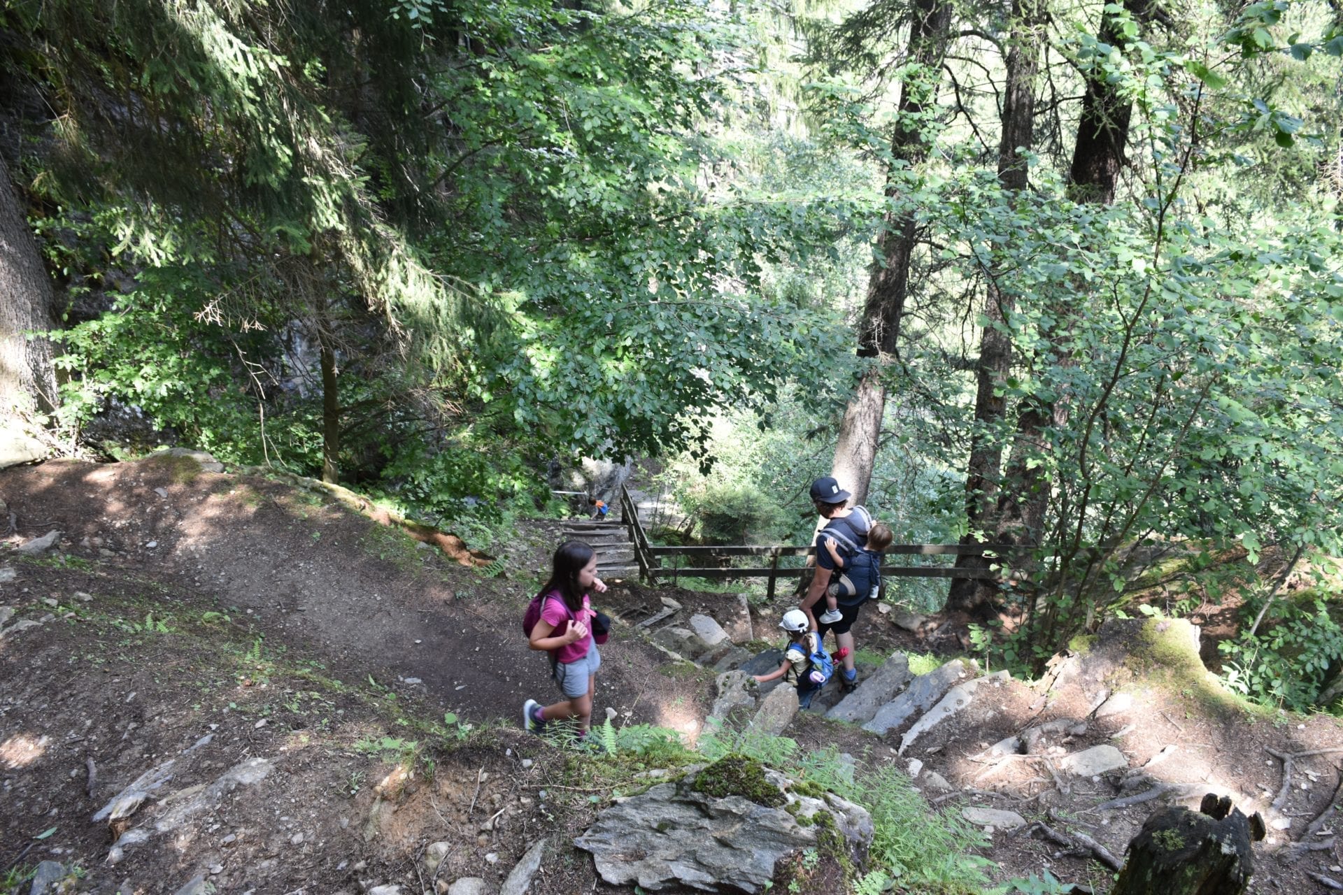 Puis, une fois nos estomacs bien remplis, nous reprenons notre route. La descente vers les gorges, bien que facile, demande une attention constante et il faut avoir en permanence ses enfants Ă lâĆil. Entre escaliers en bois et escaliers en pierre se trouve des sentiers forestiers, tout aussi raides pour la plupart. Ce jour-lĂ , en plein Ă©tĂ©, il fait grand beau, mais comme la pluie est tombĂ©e la veille, nous constatons que certains passages demeurent humides et glissants.