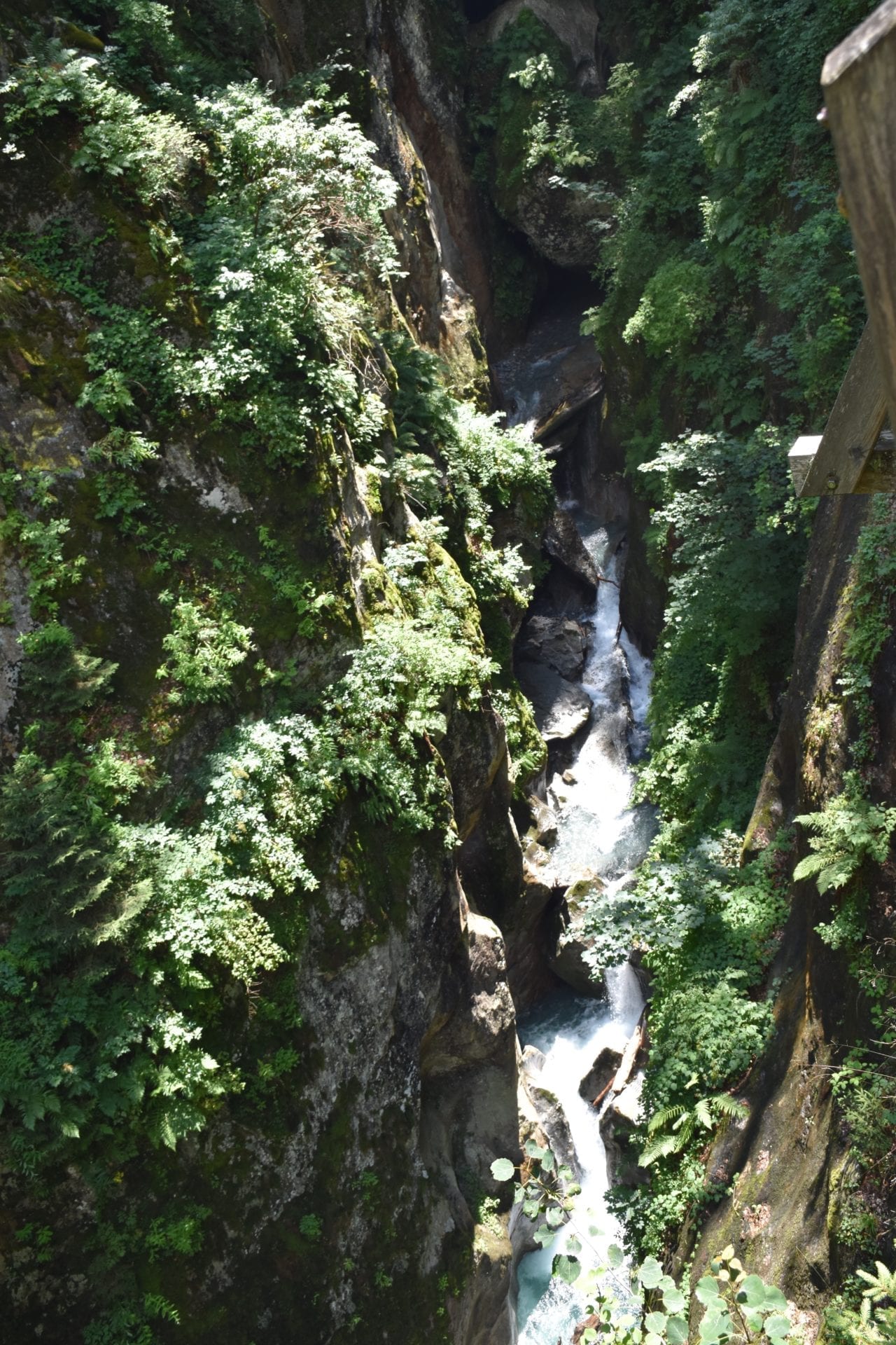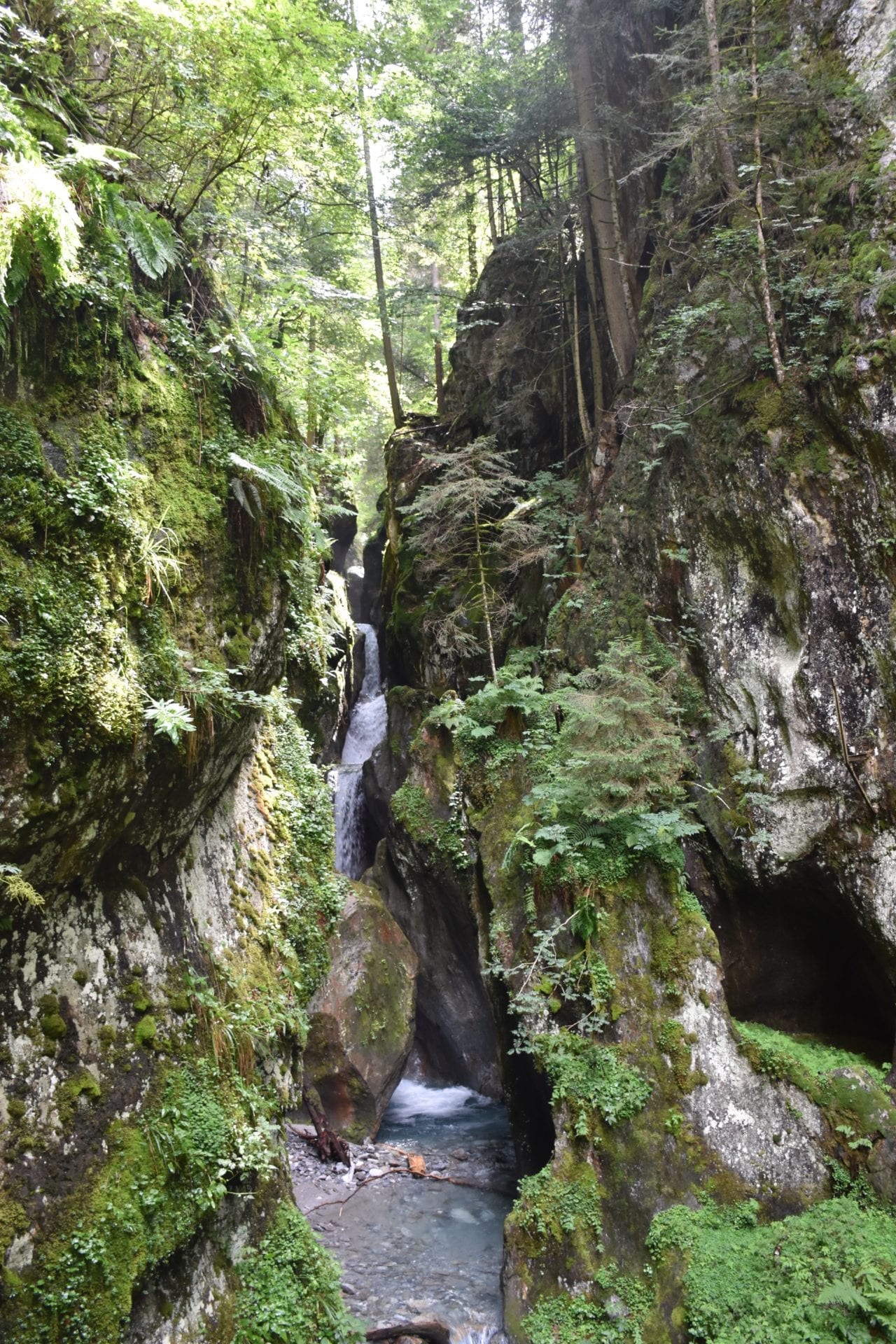 AprĂšs environ 30 minutes de marche nous arrivons Ă ces fameuses Gorges MystĂ©rieuses. En contre-bas nous apercevons le torrent, la hauteur Ă laquelle nous nous trouvons est impressionnante. Nous empruntons la passerelle de 120 mĂštres, surplombant les gorges, et nous nous retrouvons face Ă une sĂ©rie de magnifiques cascades. Lâeau sâengouffre dans une cavitĂ©, une grotte secrĂšte nommĂ©e la Grottes aux Nymphes ou le Temple des Nymphes. CachĂ©e sous de gigantesques rochers posĂ©s les uns contre les autres en Ă©quilibre, la cavitĂ© est invisible. Elle nâa dâailleurs Ă©tĂ© dĂ©couverte quâen 1884 et a fait de ces gorges lâune des curiositĂ©s les plus cĂ©lĂšbres de Suisse.
