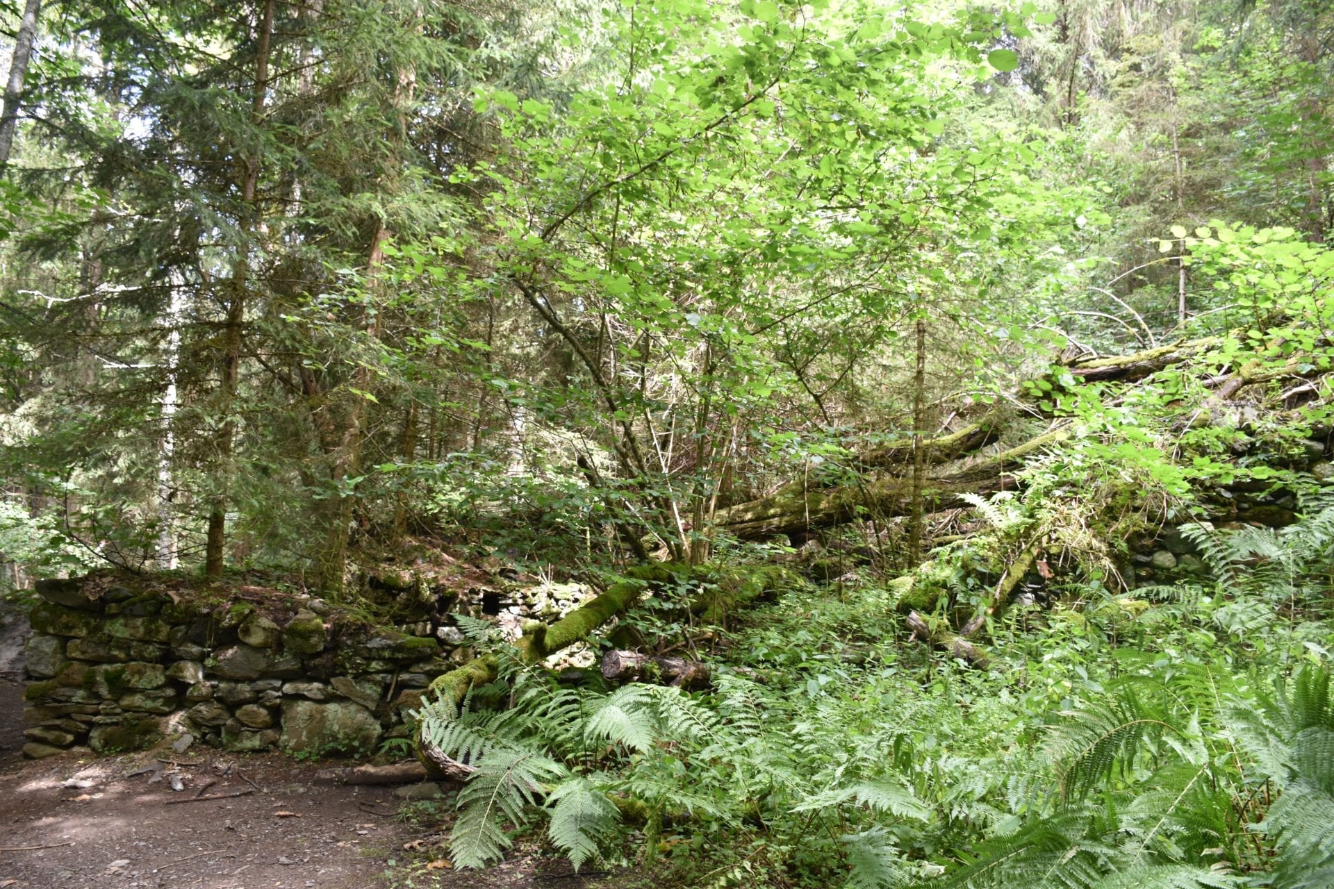 AprĂšs avoir admirĂ© le site sous tous les angles et usĂ© de notre appareil photo, nous reprenons la passerelle afin de continuer et terminer cette jolie marche. Les gorges se trouvant au point le plus bas du sentier thĂ©matique, la suite de la balade se fait donc en montant.  Cette deuxiĂšme partie est moins raide, mĂȘme si nous sommes presque constamment en pente. Nous traversons la forĂȘt au couleur verdoyante et dĂ©couvrons des ruines. Puis nous continuons notre ascension, passons par le TroulĂ©ro et empruntant lâancienne route qui reliait Martigny Ă Chamonix. Nous arrivons au tunnel de TĂȘte-Noire, tunnel percĂ© entre 1827 et 1836, permettant ainsi le trajet entre Martigny et Chamonix. Nous le traversons et rejoignons la route cantonale actuelle. Le dernier bout de chemin se fait sur le bas-cĂŽtĂ© de la route grĂące Ă un petit chemin pĂ©destre et sĂ©curisĂ© jusquâau parking.