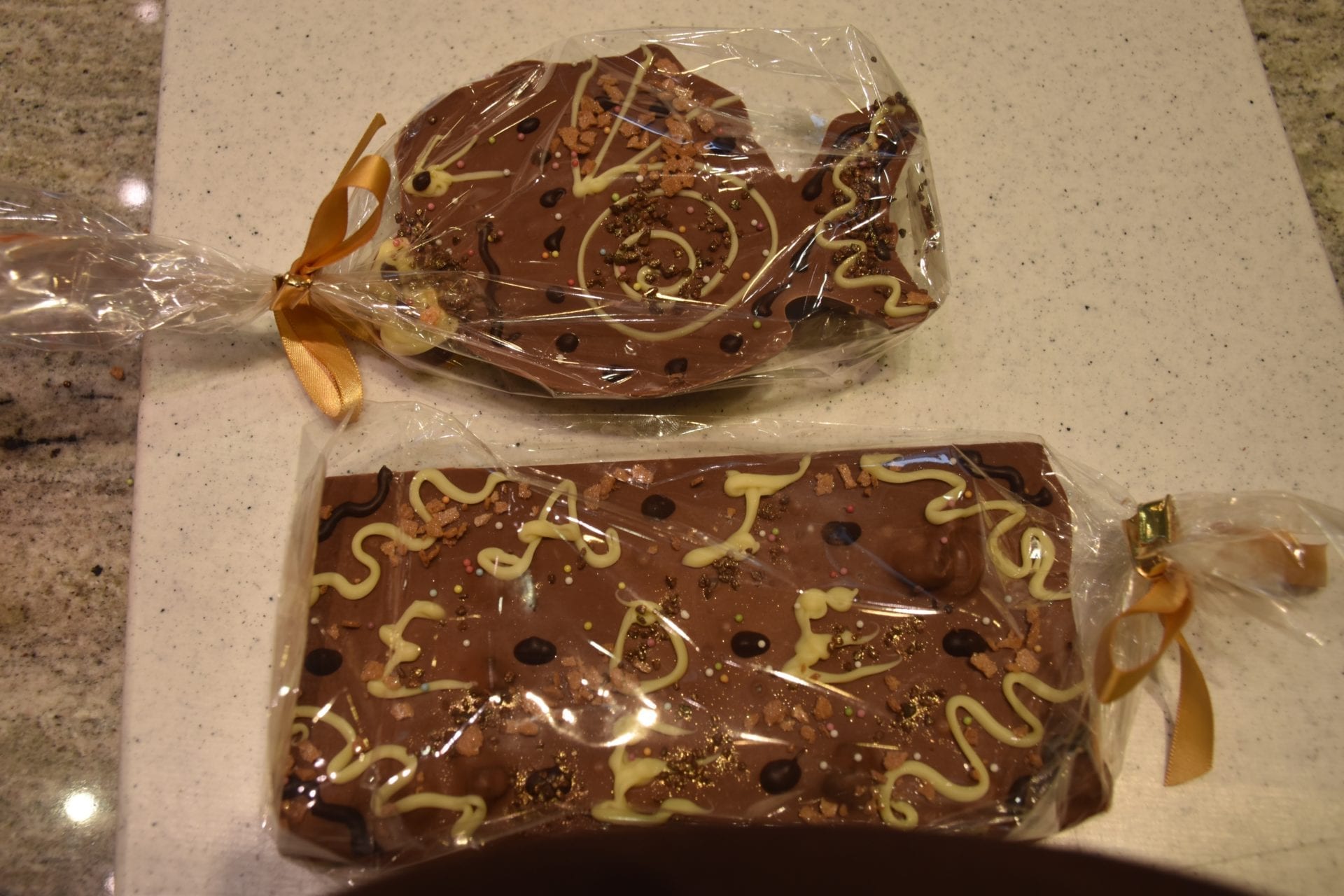 AprĂšs une quinzaine de minute nous avons rĂ©cupĂ©rĂ©s nos crĂ©ations et sommes passĂ©s Ă la phase de dĂ©moulage et dâemballage. Nous Ă©tions, parents et enfants, ravis de voir le rĂ©sultat final de notre travail. Nous sommes, bien entendu repartis avec nos Ćuvres chocolatĂ©es ainsi quâavec les tabliers Cailler, reçus en cadeau au dĂ©but de lâatelier. Les Lutins Ă©taient trop contents de pouvoir les emporter Ă la maison. Et aprĂšs 1h30 dâatelier, et avoir remerciĂ© chaleureusement les chocolatiers, nous avons rĂ©cupĂ©rĂ©s nos manteaux et nos affaires pour la suite de la visite de la Maison Cailler.