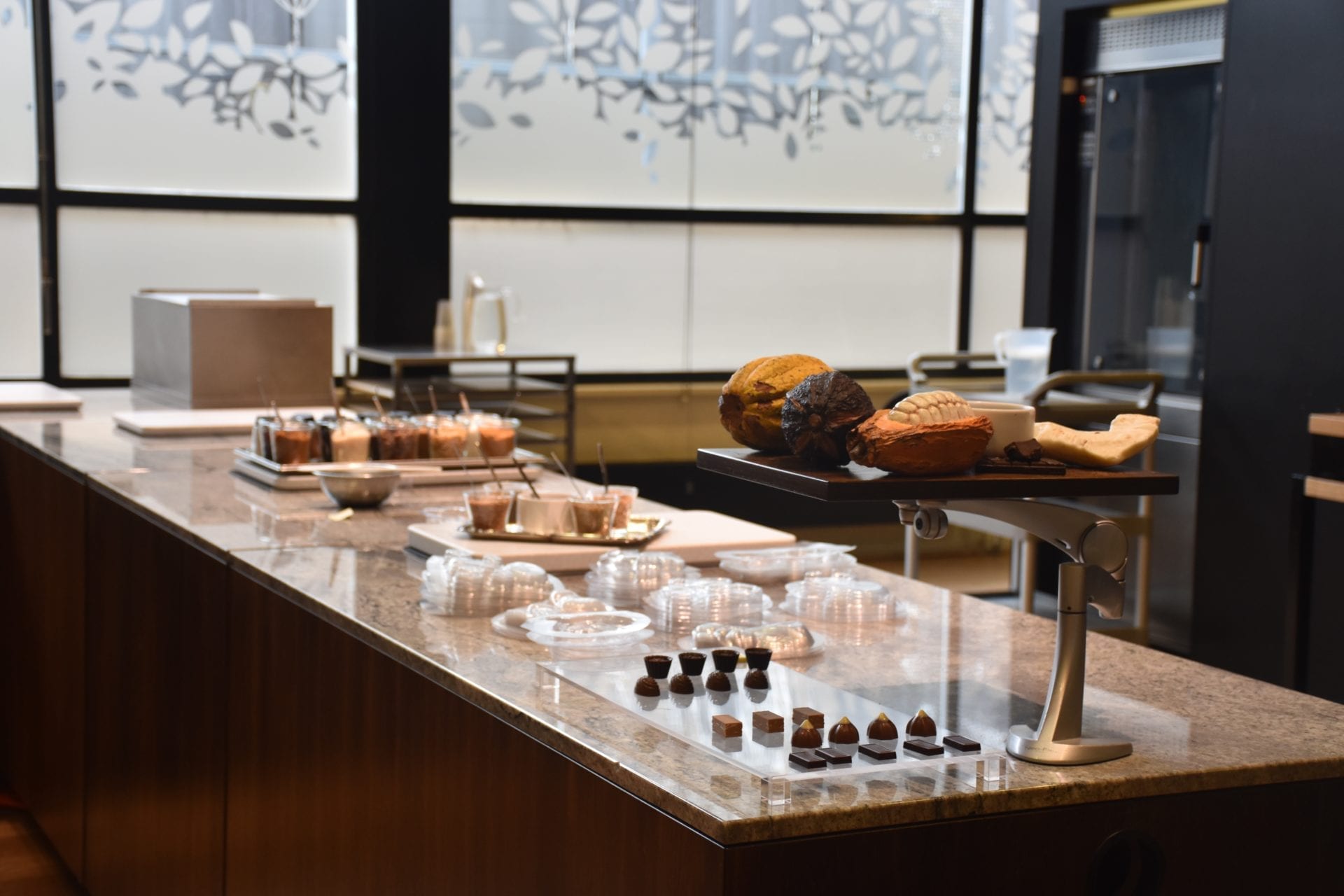 Mais avant de parler de la visite, nous voici donc Ă lâentrĂ©e de lâatelier du chocolat. Une fois nos manteaux et sacs dĂ©posĂ©s, nous prenons place, tous les quatre, devant notre plan de travail. Les ateliers du chocolat se font par groupe et sont animĂ©s par des chocolatiers expĂ©rimentĂ©s.