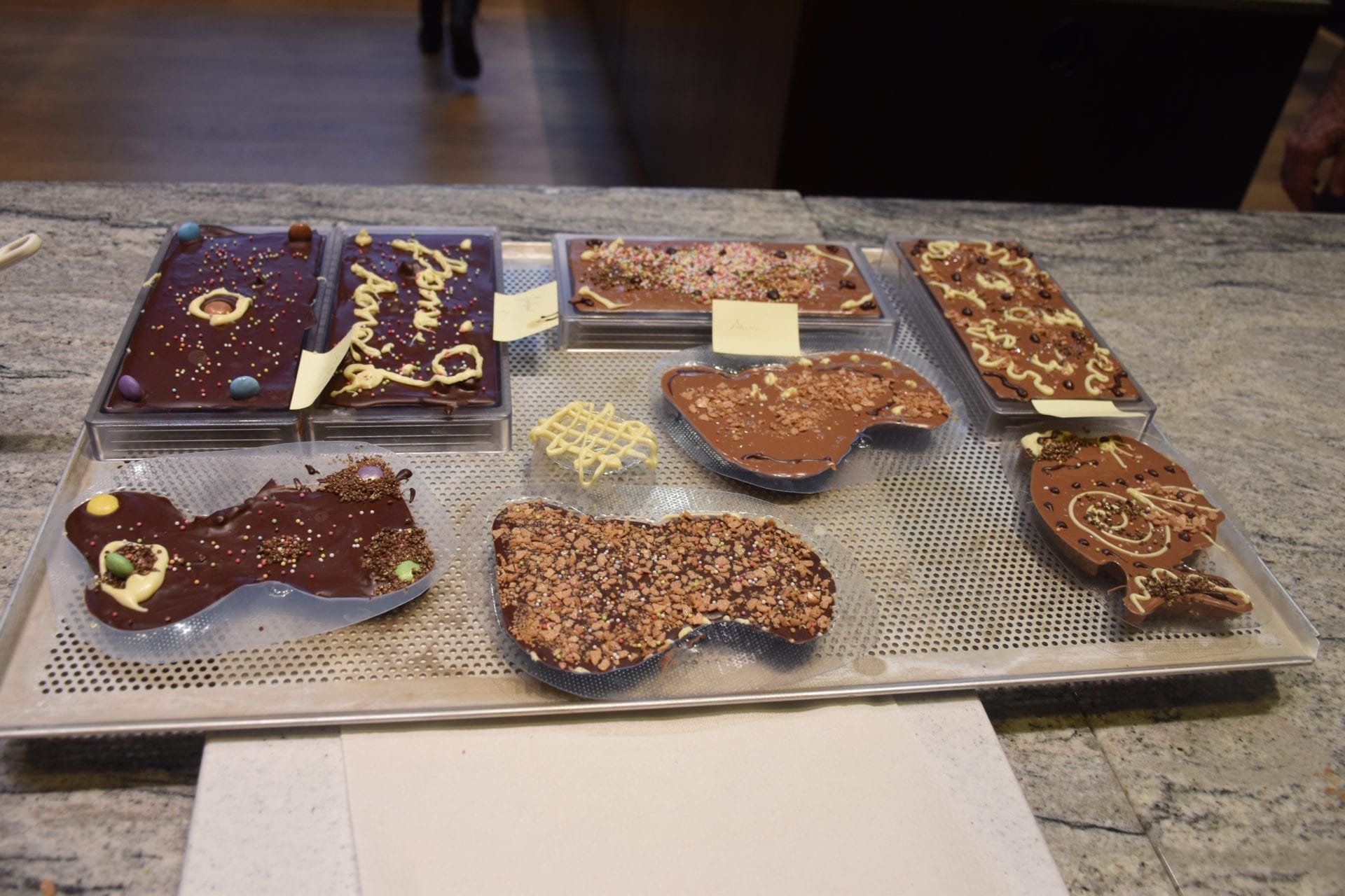 AprĂšs un accueil chaleureux accompagnĂ© dâune petite dĂ©gustation de chocolat, nous assistons Ă la dĂ©monstration de ce que nous allons devoir exĂ©cuter par la suite. Au programme, la rĂ©alisation dâune tablette de chocolat Cailler ainsi que dâun chocolat en forme dâanimal, le tout personnalisĂ© selon nos souhaits. Nous avons attentivement suivi toutes les Ă©tapes, nos Lutins Ă©taient admiratifs du travail du chocolatier. Puis ce fut notre tour. Nous avons commencĂ© par choisir le chocolat pour les dĂ©corations (noir, au lait, blanc), prĂ©parĂ© dâavance dans des poches Ă douilles. Ensuite nous avons pu choisir le chocolat de base de notre tablette et de notre animal (Ă nouveau noir, au lait, blanc), agrĂ©mentĂ© dâĂ©pices et de divers ingrĂ©dients tels que fruits, caramel, meringue etc⊠selon nos envies. Une fois nos moulages de bases prĂȘts nous avons pu nous lancer dans les dĂ©corations finales avec Ă nouveaux les poches Ă douilles pleines de chocolats ainsi que des pĂ©pites de chocolats dorĂ©s ou argentĂ©s, des perles de couleurs et des smarties. Une fois nos moulages de chocolat terminĂ©s nous les avons mis au frais pour quâils refroidissent. Et pendant ce temps-lĂ nous avons eu droit Ă une dĂ©monstration et explication de la technique du tempĂ©rage du chocolat.
