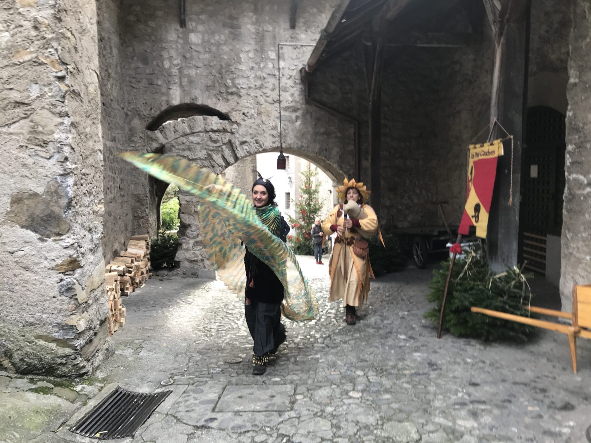 La troupe termine sa chorégraphie et deux comédiennes déambulent à leur tour dans les rues pavées en dansant et jouant de la musique.