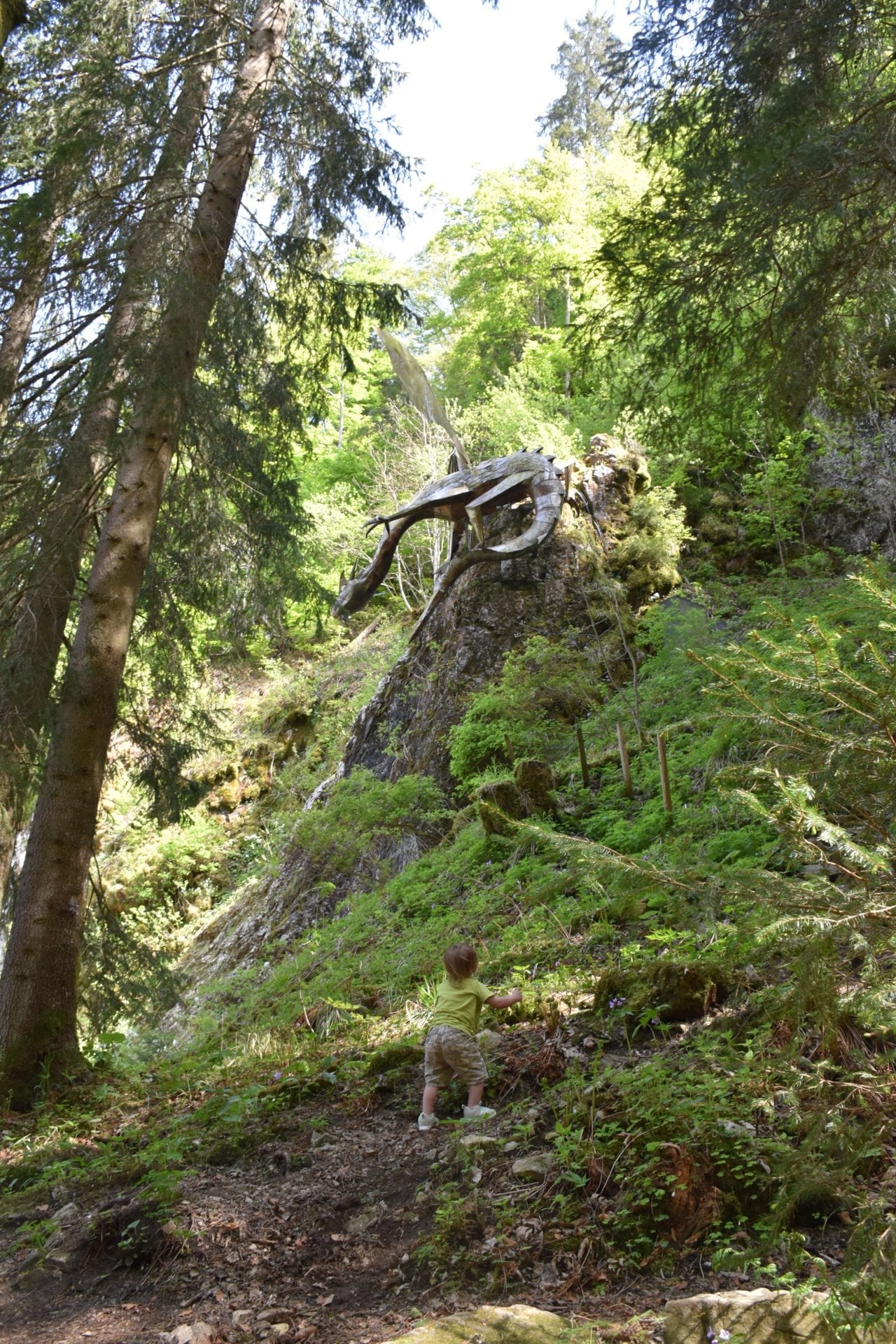 Au dĂ©tour d’un virage, perchĂ© sur un rocher, un dragon vous attend et vous surprend ! Tout en mĂ©tal, il semble pourtant prĂȘt Ă  nous bondir dessus.