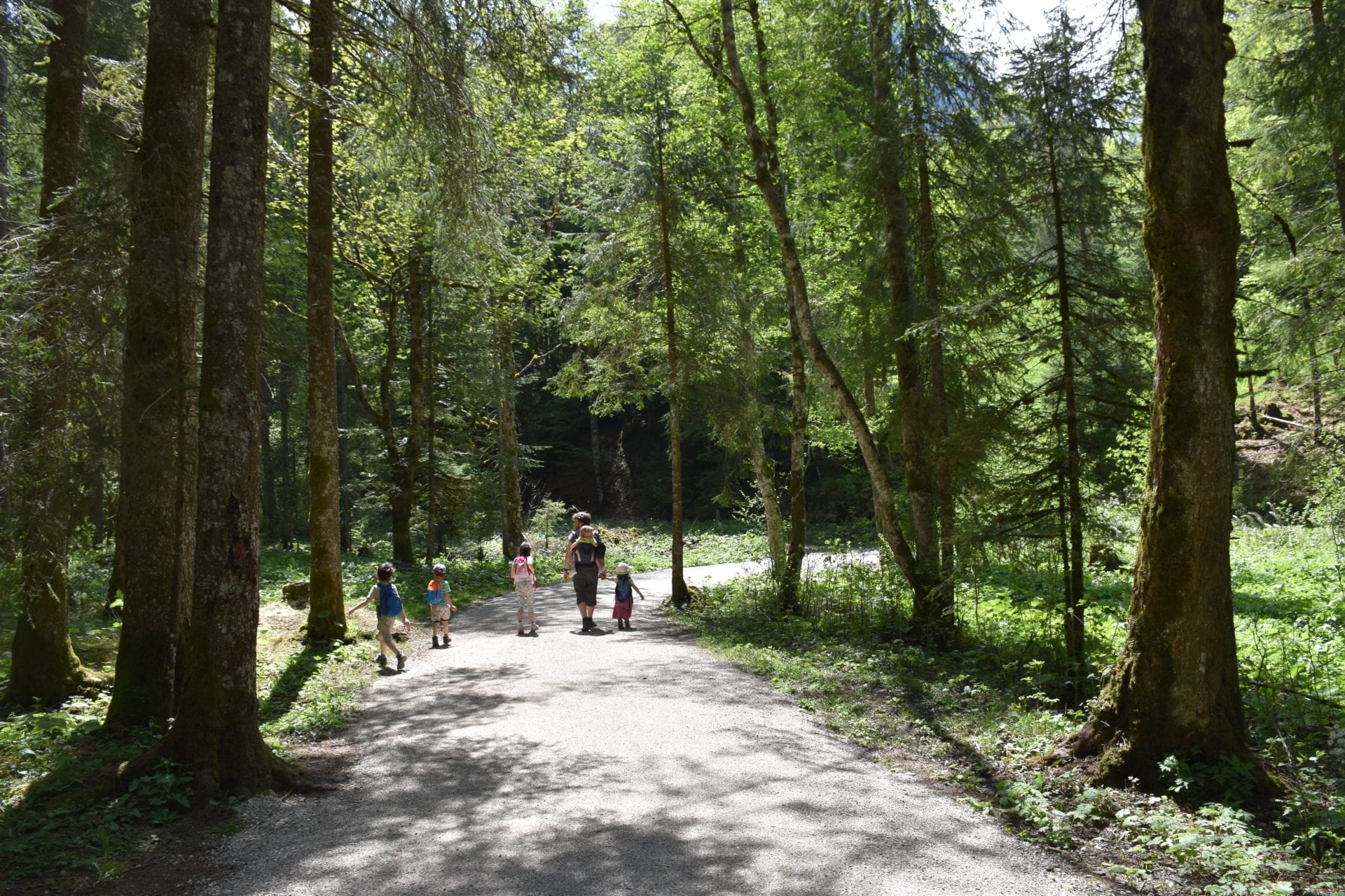 Pour notre part, nous nous sommes parquĂ©s sur le principal et avons entamĂ© le tour du lac par la gauche. La premiĂšre partie du sentier est assez Ă  dĂ©couvert et traverse les alpages. Puis nous arrivons dans une forĂȘt, oĂč la fraĂźcheur est agrĂ©able. C’est dans cette partie forestiĂšre, en face du poste « de la vache noire » que se trouve une trĂšs jolie place de pique-nique, au bord d’un petit ruisseau qui finit sa course dans le lac.