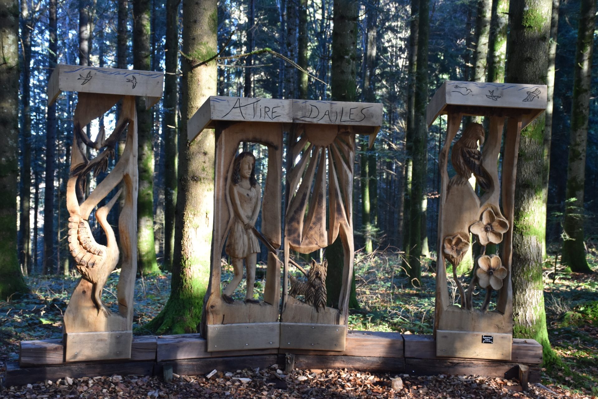 Le sentier « A tire dâailes » est jalonnĂ© de diverses sculptures en bois. Lutin5 Ă©tait ravi de pouvoir se balader et admirer des belles reprĂ©sentations dâoiseaux, dâanimaux et de personnages. Nous avons ainsi croisĂ© des hiboux, des aigles, des biches, des renards, des lutins et tant dâautres !