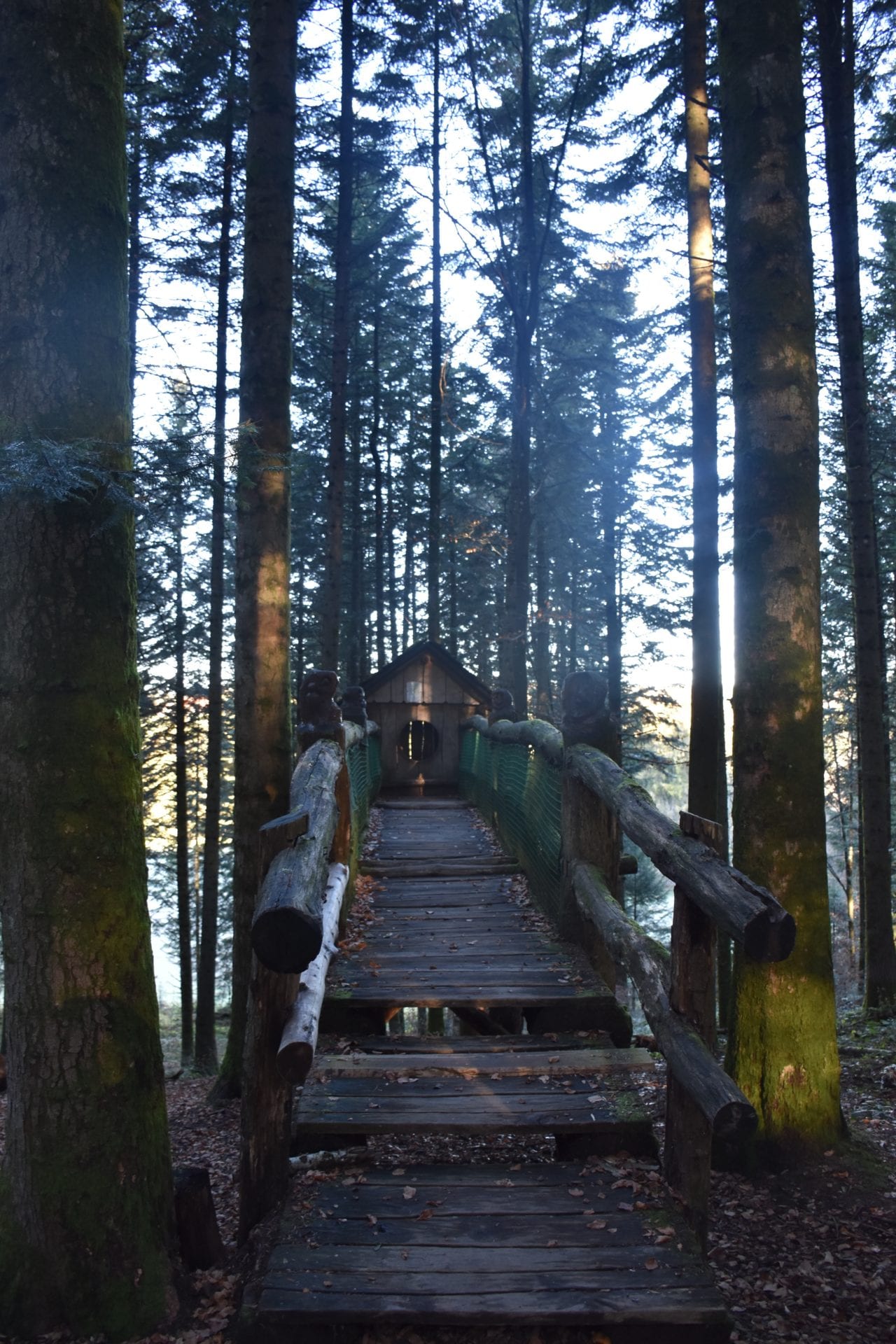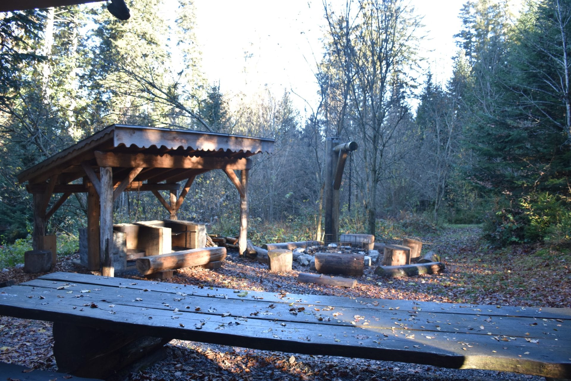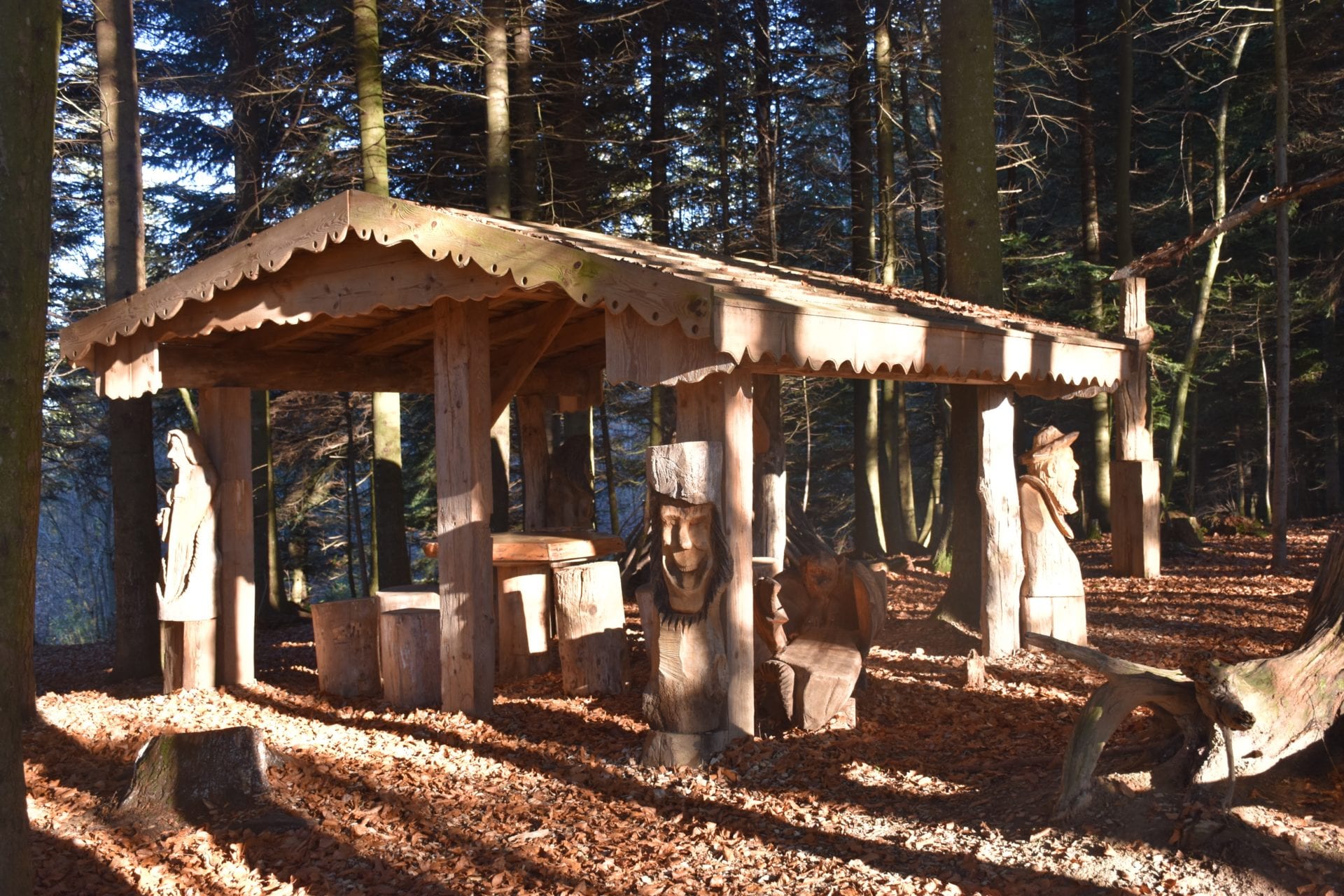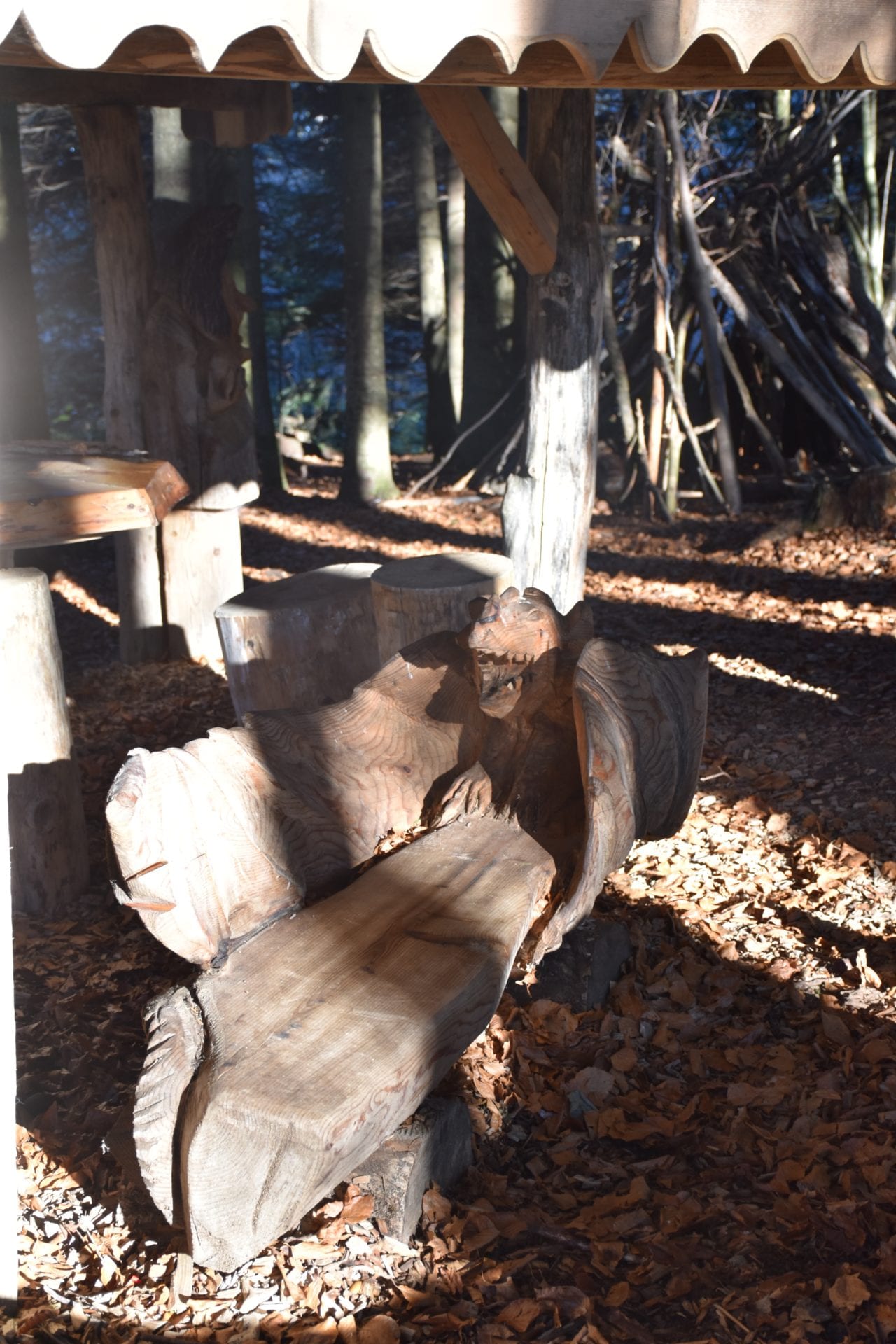 Bien amĂ©nagĂ©e et avec de trĂšs belles sculptures, cette place de pique-nique est magnifique ! Notre Lutin5 a particuliĂšrement aimĂ© un banc en bois sculptĂ© en forme de dragon ! Lâambiance de ce lieu a Ă©tĂ© pensĂ©e pour nous amener dans un univers presque féérique, quelque peu hors du temps. Nous avons mĂȘme pu admirer une ribambelle de sapins poussant sur le toit de lâabri principal.