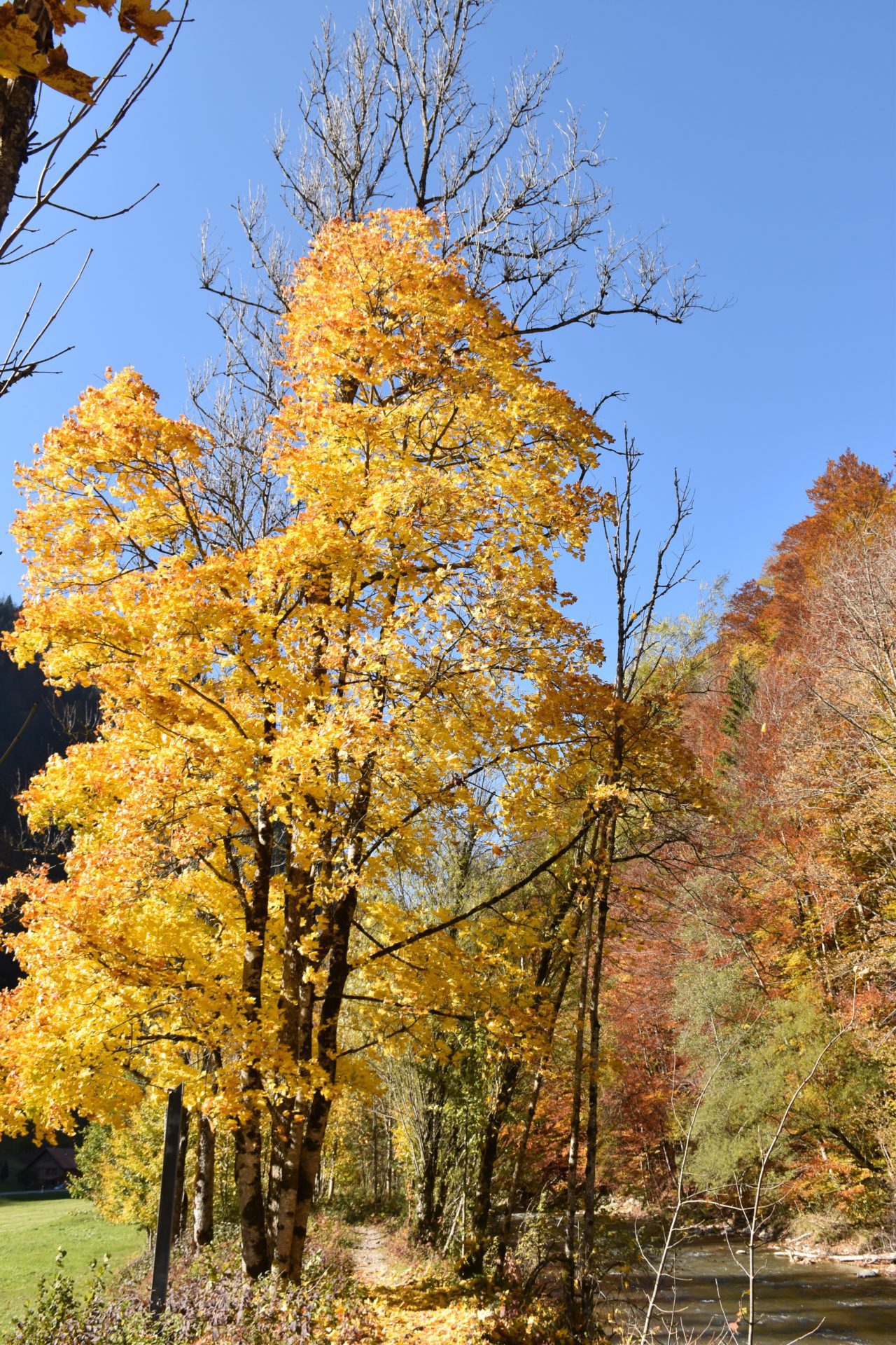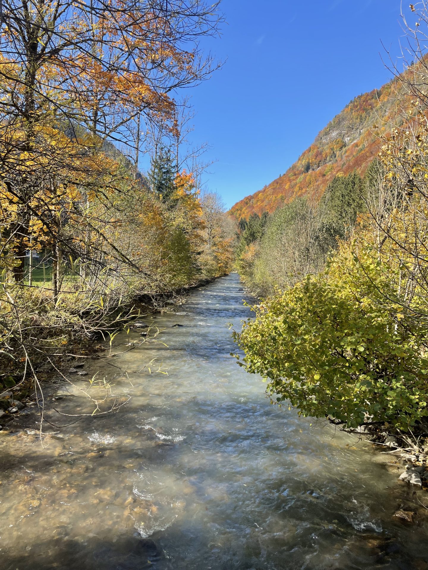 Le sentier botanique suit la rivière de la Jogne. Im Fang fait partie de la région alémanique du canton de Fribourg, mais les quelques panneaux didactiques qui jalonnent le sentier sont pour la plupart bilingues.