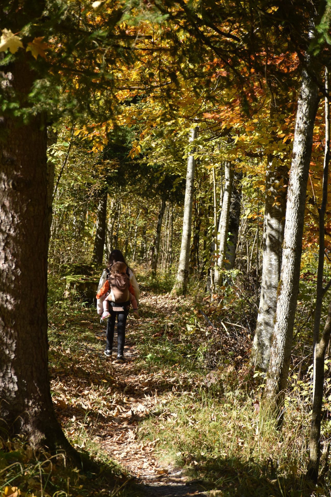 Puis nous reprenons la route et poursuivons le sentier, celui-ci devient plus caillouteux et après quelques mètres, se rétrécit, il n’est plus possible d’y accéder avec une poussette. Heureusement pour nous, nous ne prenons jamais de poussette pour nos randonnées et balades. Nous avons toujours préféré les porte-bébés.