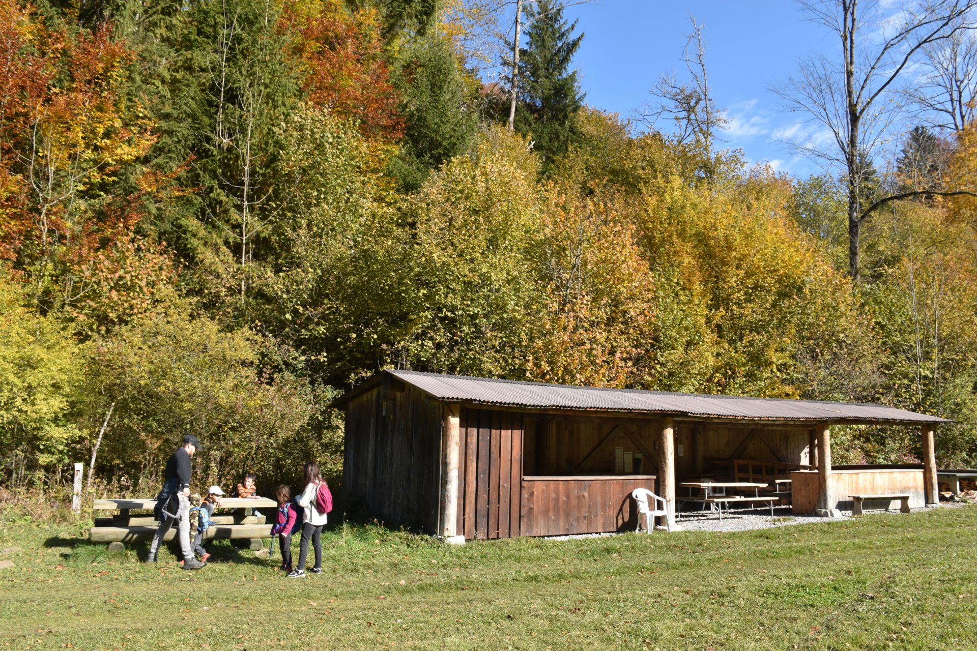 La première partie du sentier se fait sur un chemin assez large et est facilement accessible avec une poussette. Rapidement nous atteignons une cabane et une place de pique-nique aménagée avec un beau terrain en herbe. Au fond, nous entendons le doux chant de la rivière. Nous décidons de nous arrêter à cet endroit pour pique-niquer. Les enfants en profitent aussi pour courir aux alentours et découvrir la rivière.