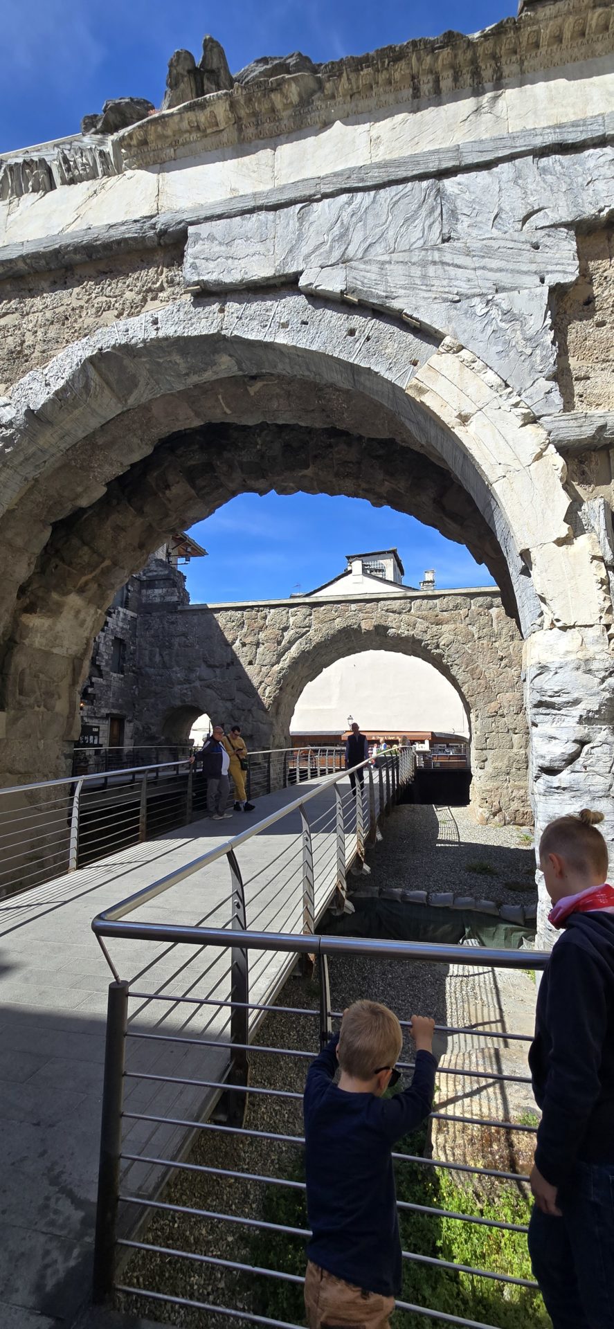 Pour relier l’Arc d’Auguste ( Ă  cĂŽtĂ© duquel se trouve un parking, d’ailleurs !) aux portes romaines puis au Cryptoportique, nous avons dĂ©ambulĂ© dans la vieille ville d’Aoste. La petite rue pavĂ©e est trĂšs charmante et regorge de boutiques souvenirs ou de petits cafĂ©s pour faire une halte durant les visites. Le trafic y est presque inexistant (sauf bordiers) donc c’est vraiment trĂšs agrĂ©able de s’y balader en famille.